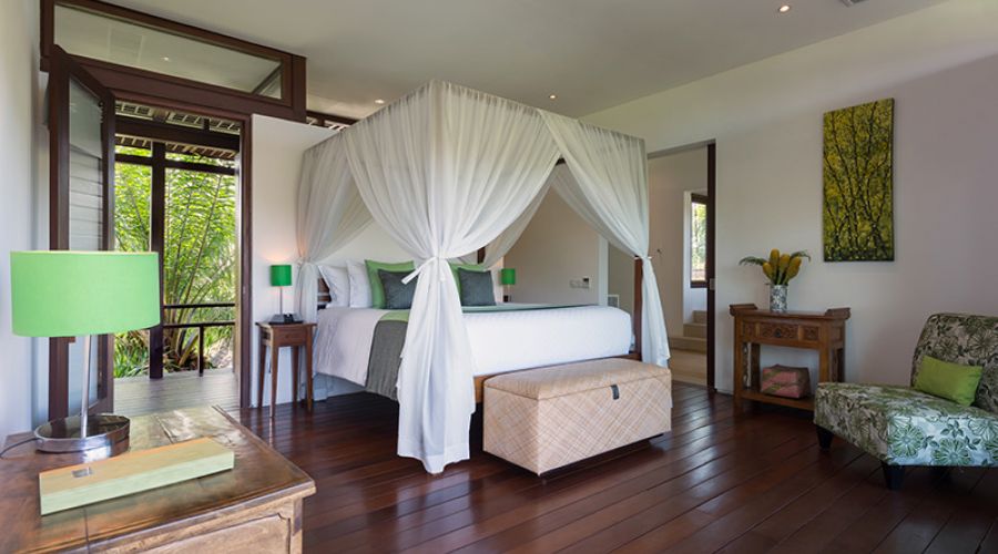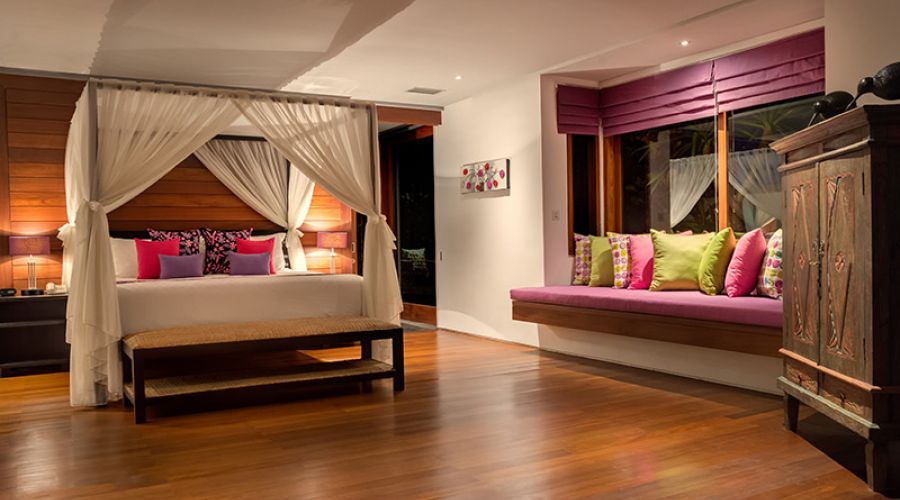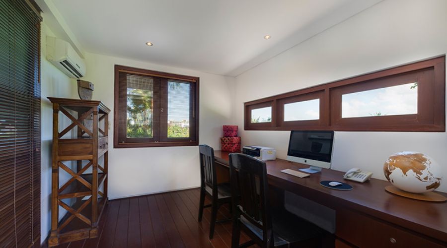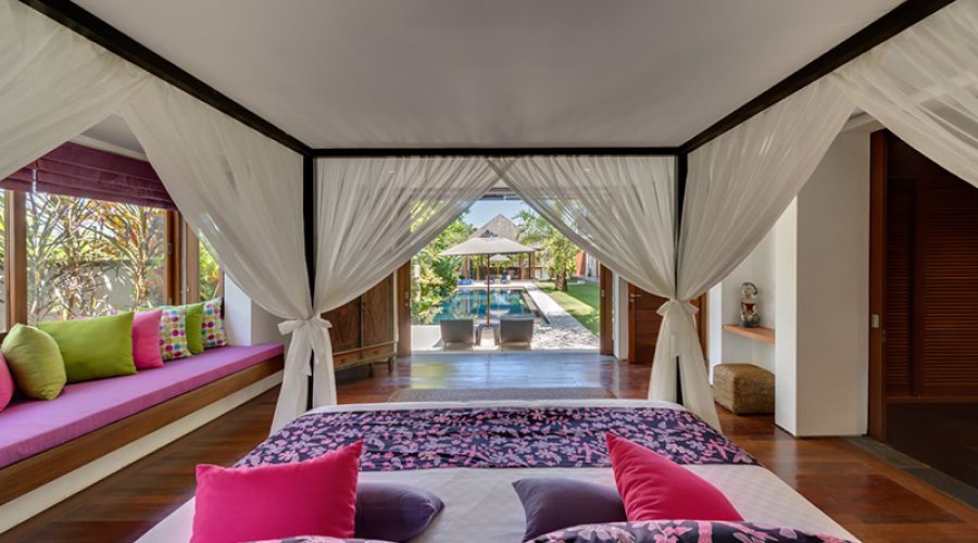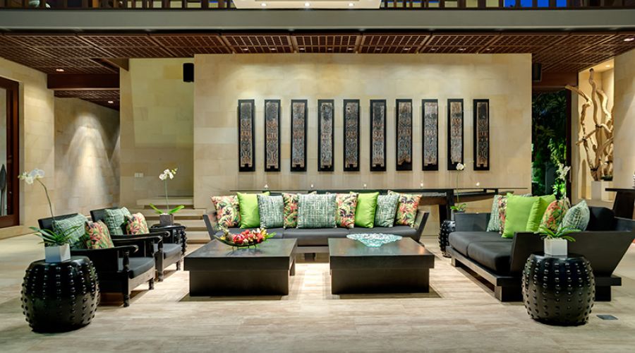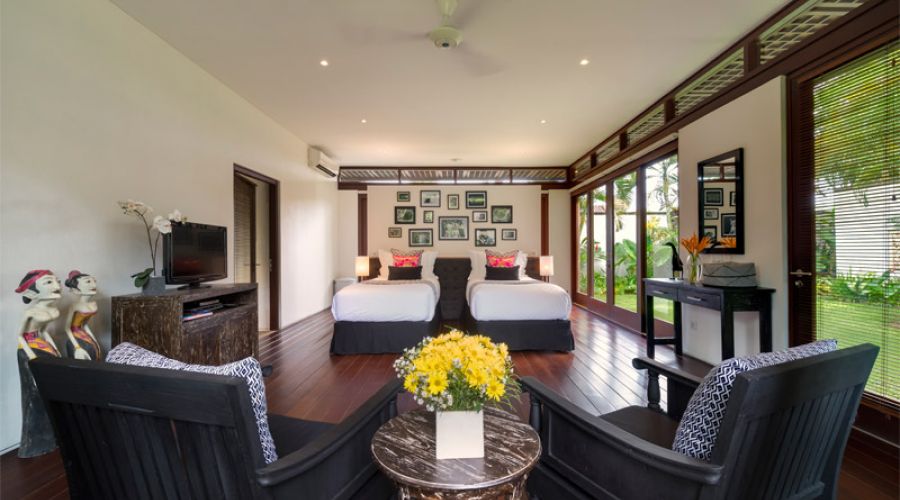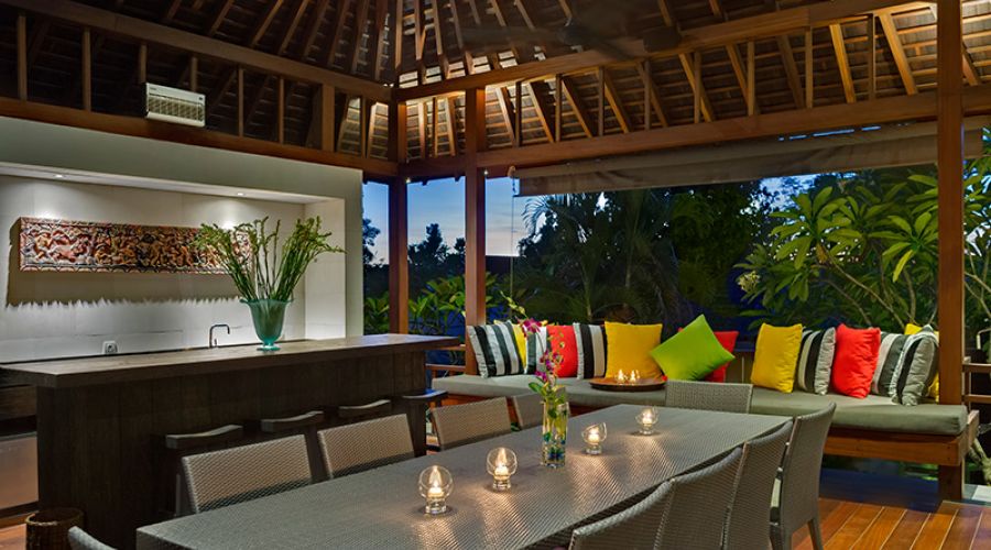 The villa’s contemporary design is enhanced, outside and in, with the highest quality materials, all chosen for their natural beauty and durability. Thoughtfully chosen Balinese and Javanese sculptures, cabinets and artefacts – many of them antique – as well as bright floral fabrics and custom-printed traditional ikat textiles bring the stylish dark-wood furniture to vivid life. State-of-the-art facilities include a Sonos digital music system that can be programmed to match musical moods in several different ‘zones’, a modern kitchen, satellite television and DVD players and air conditioning in all the indoor areas.