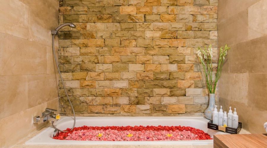 Downstairs is an open air kitchenette and living area that blends flawless into the outdoors with defined areas to relax, sit and dine in luxury style. The master bedroom is on the ground floor and features a elegance en-suite bathroom with a separate bath tub and rain shower. A second bedroom is a twin bed located upstairs with similar facilities to ensure a quality luxury in villa stay.