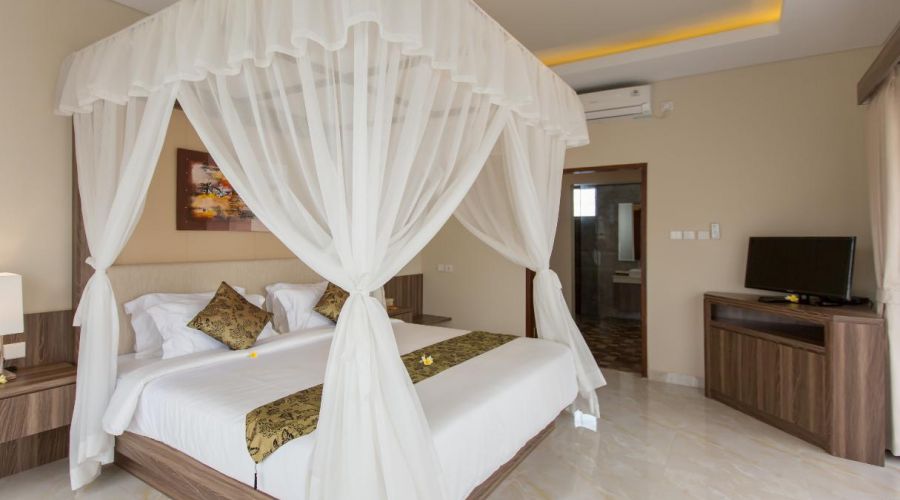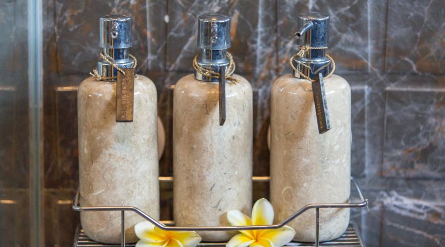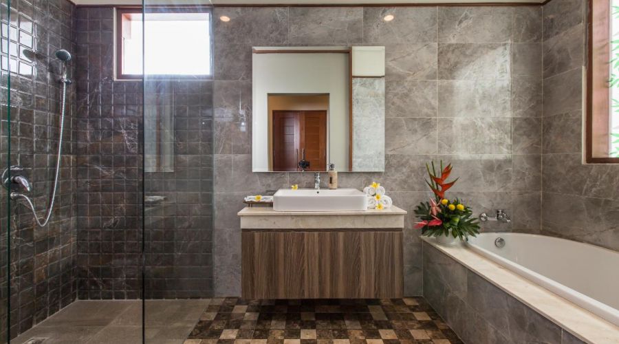 The dining table for 6 persons is perfect for sharing a good meal with family or friends. The first bedroom is on the ground floor and upstairs, a continuous balcony leads to two others bedrooms. Each bedroom is composed by a king size bed, a TV and the air conditioning. The pretty decoration and the pool view of each bedroom will please you. A large dressing room with mirrors leads to the bathroom, which includes a sink with its mirror, a stunning bathtub and a huge semi-open shower. The modern style with marble on the walls give an incredible atmosphere.