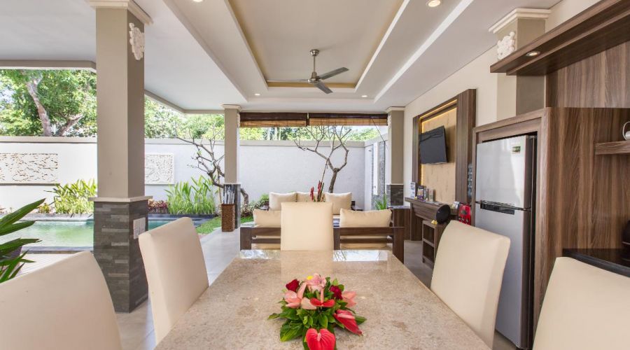 While entering, you’ll be impressed by the atmosphere and the decoration. The ground floor is featuring a large open style living and dining area facing the pool (8 x 4 m). The outdoor shower it’s perfect after a swim. The sunbeds are just optimum for relaxing by the pool. The living room provides a large leather sofa and chair with its coffee table in an open space with view on the tropical pool space. In this area, you’ll also find an open kitchen, which is all equipped.