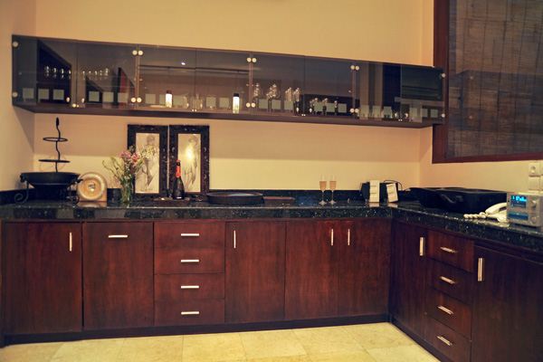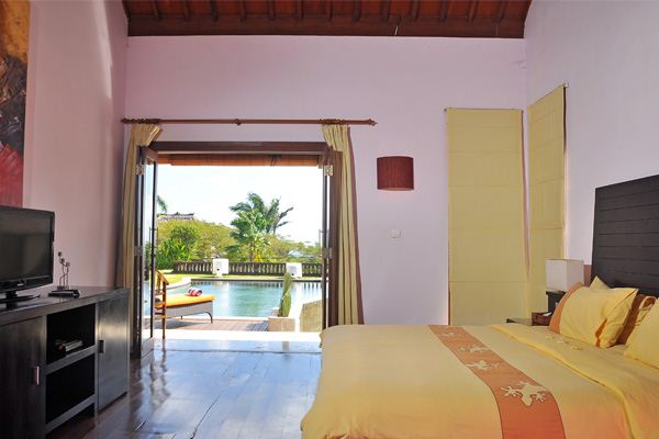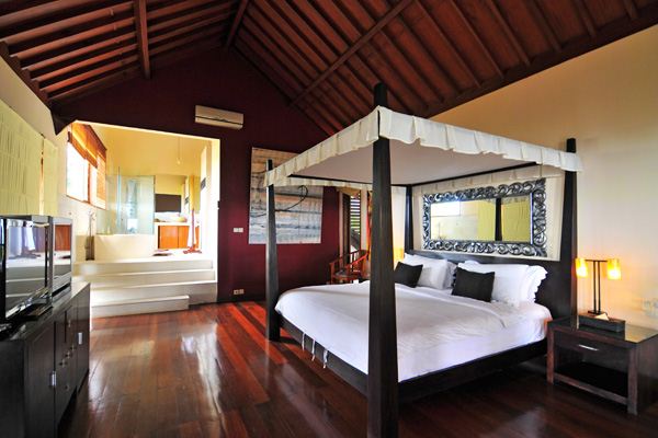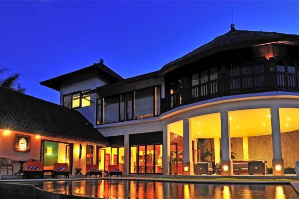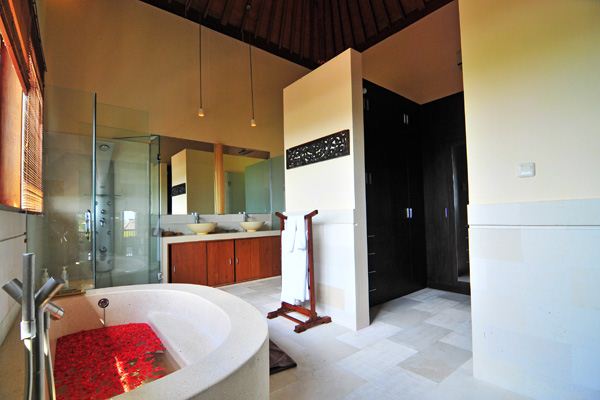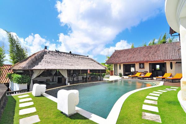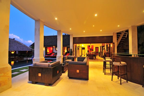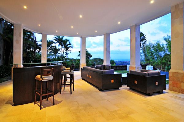 This 500 m2 luxury modern villa features L shaped white stone and wood building nicely decorated with some Balinese touches, and contemporary furniture. The villa is especially designed to organize party in the very spacious and comfortable common area and to appreciate the marvelous view particularly from the pool and Jacuzzi area, the open space living room, the large Bale and the exceptional second floor library from where you dominate Bali with a unique feeling of freedom and serenity.