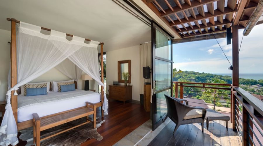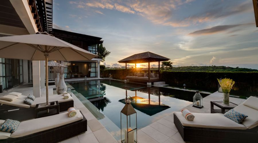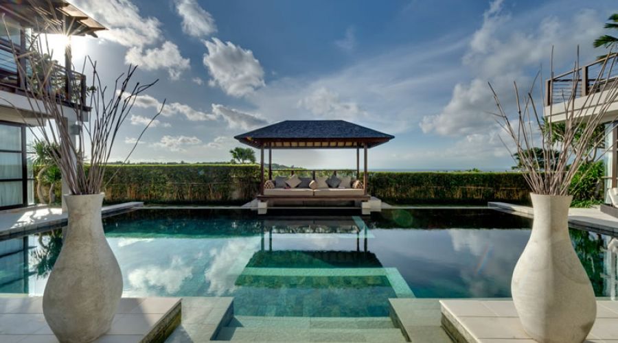 Perched high atop a hillside on Bali’s south coast, with sweeping views over the tranquil waters of Jimbaran Bay, sits this fabulous, four-bedroom, family friendly Villa.