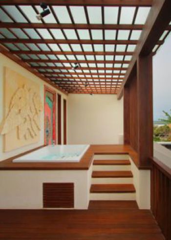 (8 Suites) Upper floor 75 m2 per suite with bedroom & living area, separate kitchenette/dining area, semi-open-air bathroom with ‘his and hers’ washbasins, bathtub and rainshower, jacuzzi, daybed and balcony.
