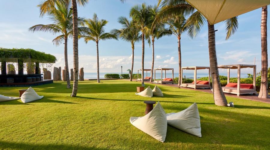 The villa is situated oceanfront beside the majestic Pantai Purnama (Full Moon Beach) on the southeast coast of Bali, in Sukawati, Gianyar. Just 15km from Sanur and 16km from Ubud. The location is minutes from a highway offering efficient accessibility to Sukawati Artmarket, Bali Marine Safari Park, Candidasa, Sanur, and Ubud. The setting is both beautiful and tranquil, with lush plantations and rice fields on one side and the glittering black crystal sands of the beach on the other.