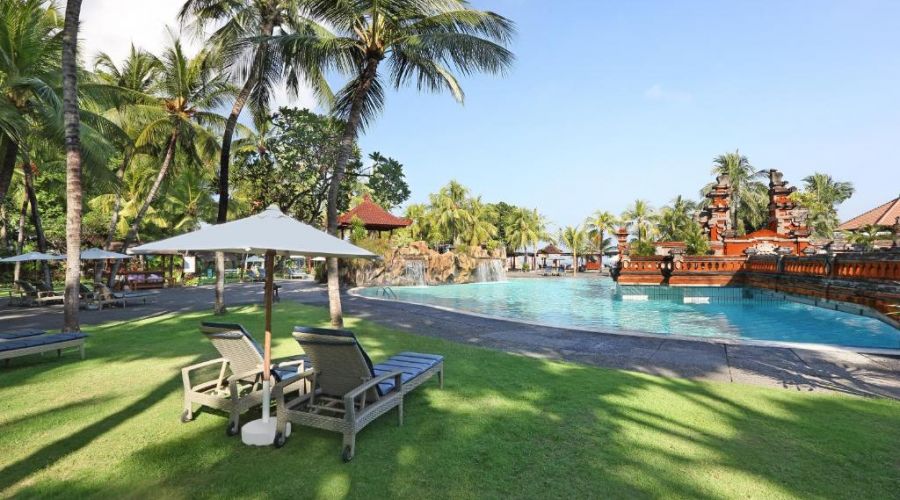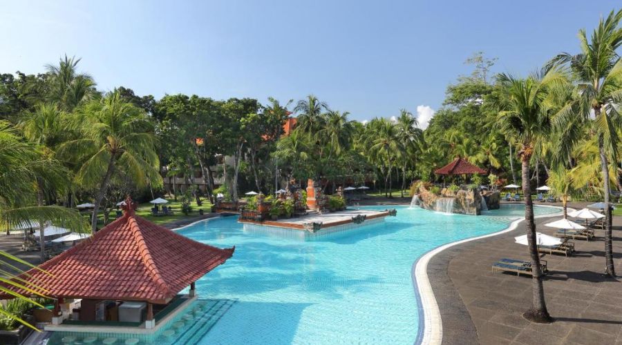 This Resort is a beach front property in the heart of South Kuta, sets in more than six hectares of tropical gardens. The resort is conveniently located just ten minutes drive from Ngurah Rai International Airport and within a walking distance to the biggest shopping centre, the Discovery Shopping Mall and Lippo Mall Kuta. 402 rooms and suites overlook the gardens featuring contemporary Balinese furnishing plus a full range of modern amenities. Hotel facilities include a free form swimming pool with cascading waterfall, Jacuzzi, swim-up bar, health club, drugstore and sauna, beach restaurant and spa. All rooms come with balcony, tea and coffee making facilities, fridge, hair dryer, IDD phone and safe deposit box. Wi-Fi is free in all rooms and hotel's public areas.