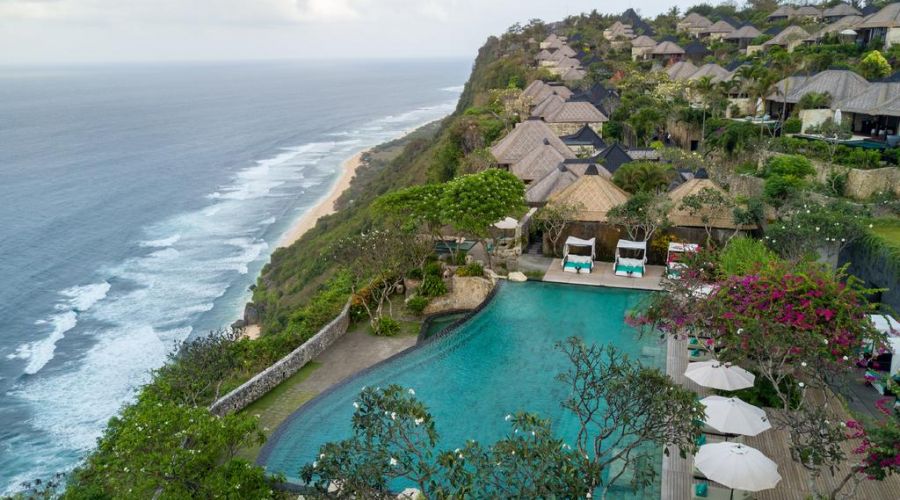 The swimming pools, inspired by rice paddies, have been lined with the green hues of Sukabumi stone.