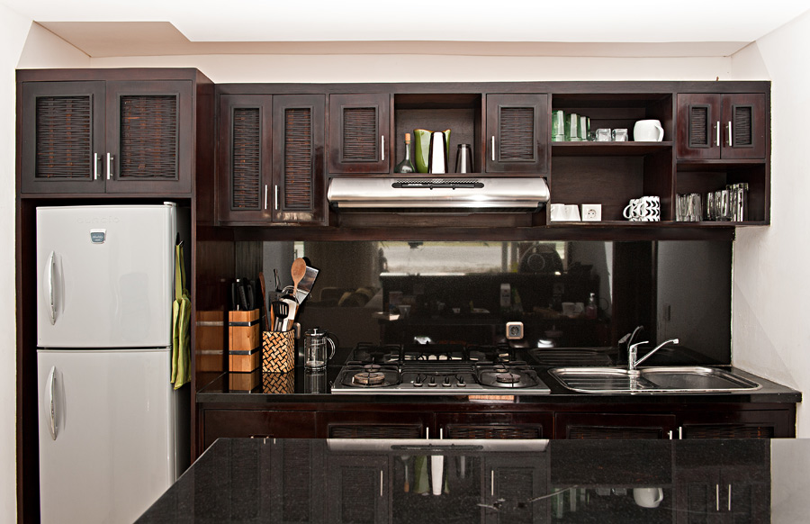 The living room has an adjacent small kitchen equipped with stove, microwave, refrigerator and all the necessary kitchen equipment. The bar stand separating the kitchen from the living-room is a perfect stage to experiment in the art of cocktail-making. Tall glass sliding doors lead to the swimming pool facing the ocean. Keep them open in the evening to allow the ocean breeze fill the living room, or close them during the hot tropical day and watch TV, DVDs or listen to music in the comfort of the air conditioned environment.
