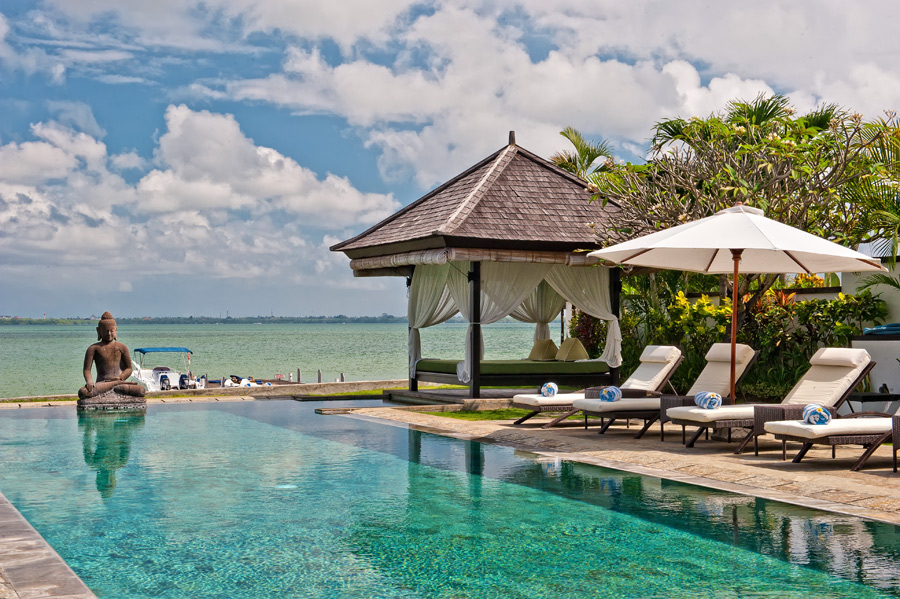 Located on the waterfront in a quiet lagoon of the popular resort area Tanjung Benoa, this villa welcomes its guests with the unforgettable ocean views. That, and a 20-meter-long swimming pool with Jacuzzi right on the ocean front, cozy pool-side gazebo and the statue of a meditating Buddha overlooking the pool and symbolizing balance and harmony.