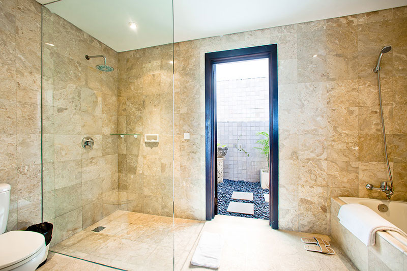 On the ground level there is a spacious living room with the other two bedrooms adjacent - one with a king size bed, another with two king single beds. Each of the bedrooms is equipped with an en-suite bathroom with a built-in closet, bathtub, and indoor and outdoor showers, and has a garden and pool access.