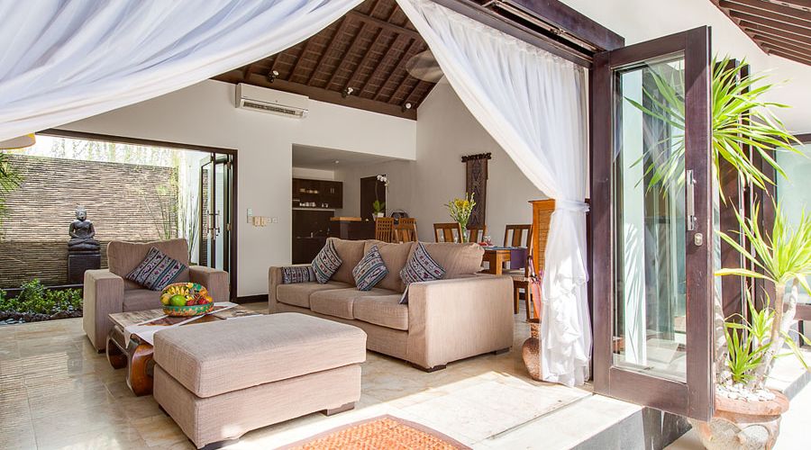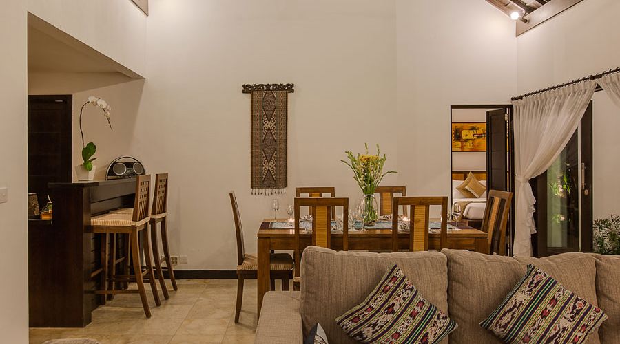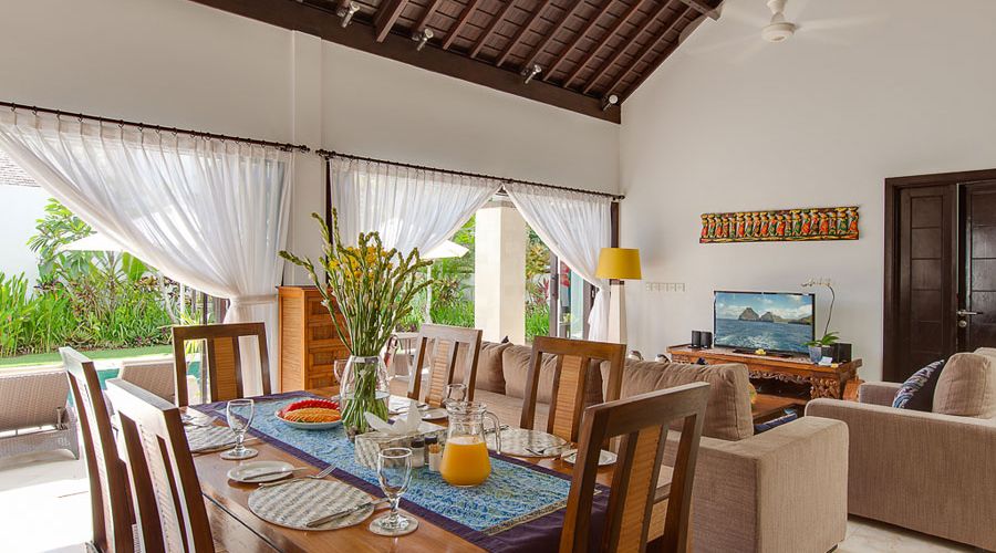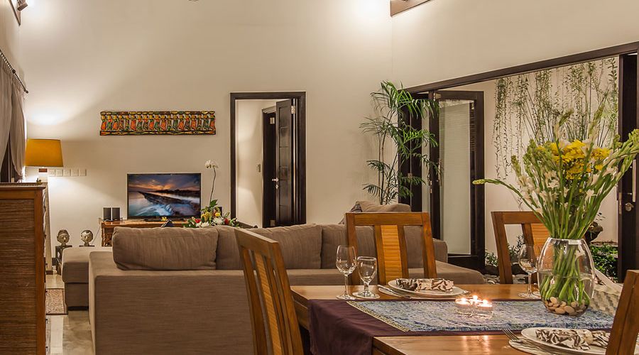 The middle space is a well-lit, high-ceilinged, multi-purpose living / dining / kitchen area with a dining table for six, soft couches, a flat screen TV with satellite TV and satellite channels, and a kitchen. A water wall at the back of the room brings the relaxing sounds of moving water inside, and French doors open up to the garden to allow the breeze to circulate throughout the villa.
