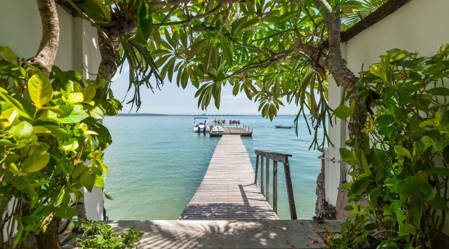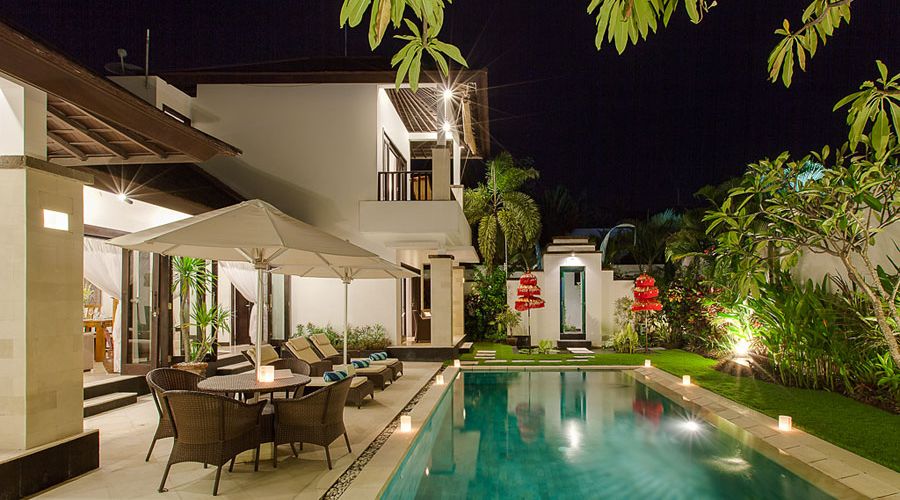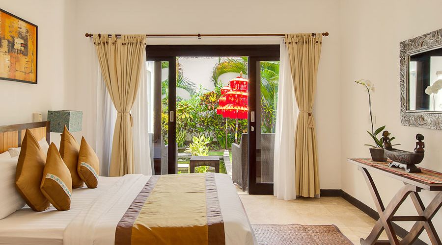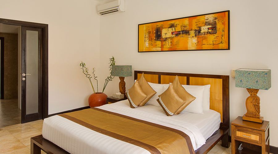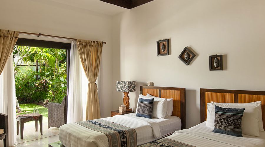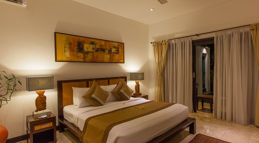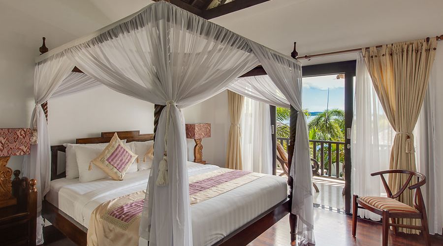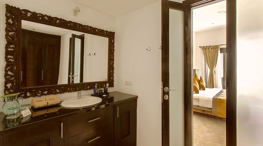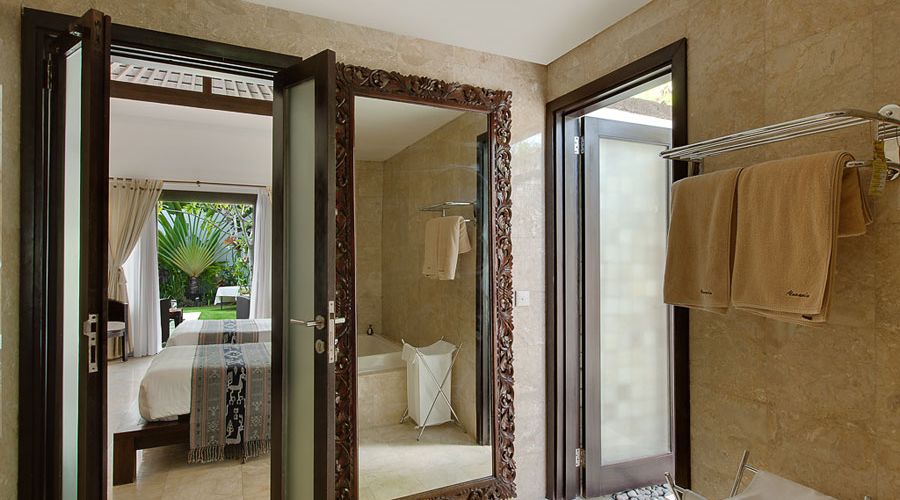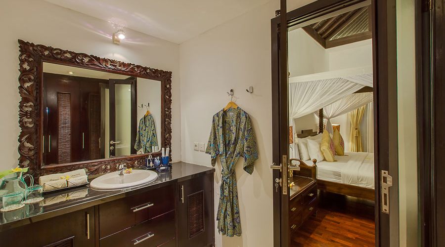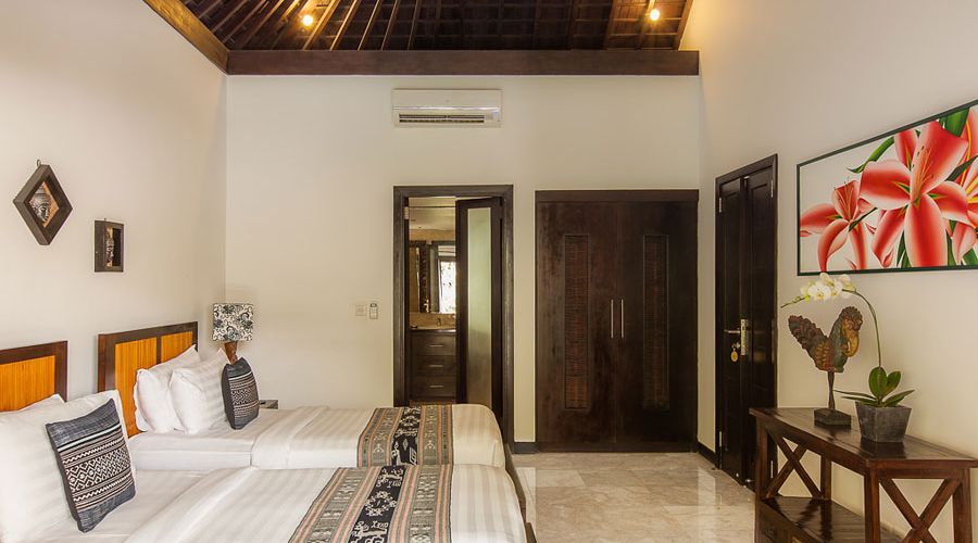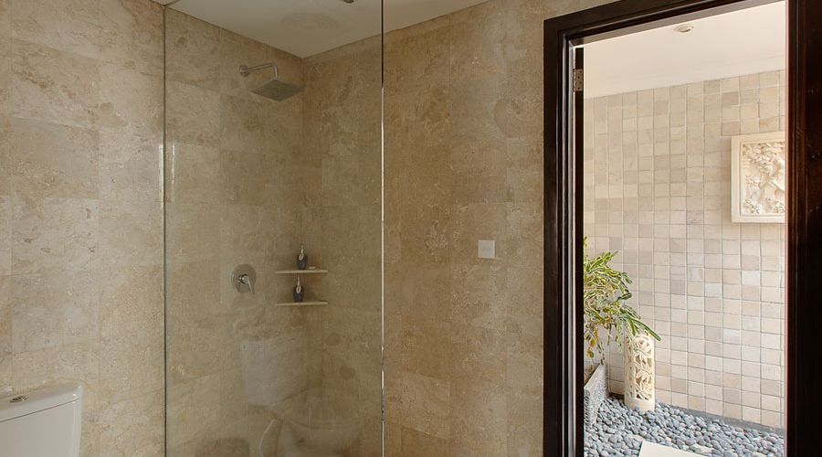 Entering through an antique Balinese door and stepping over a small fish pond Villa welcomes you into its intimate embrace with a generosity of space. There are two bedrooms downstairs at either end of the villa (one of them double and other twin) with the third master bedroom upstairs that taking in the ocean and sunset views. Each bedroom has an ensuite with monsoon showers and comes with its own small balcony or terrace.