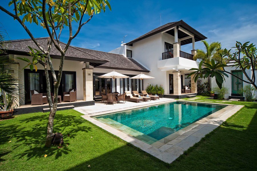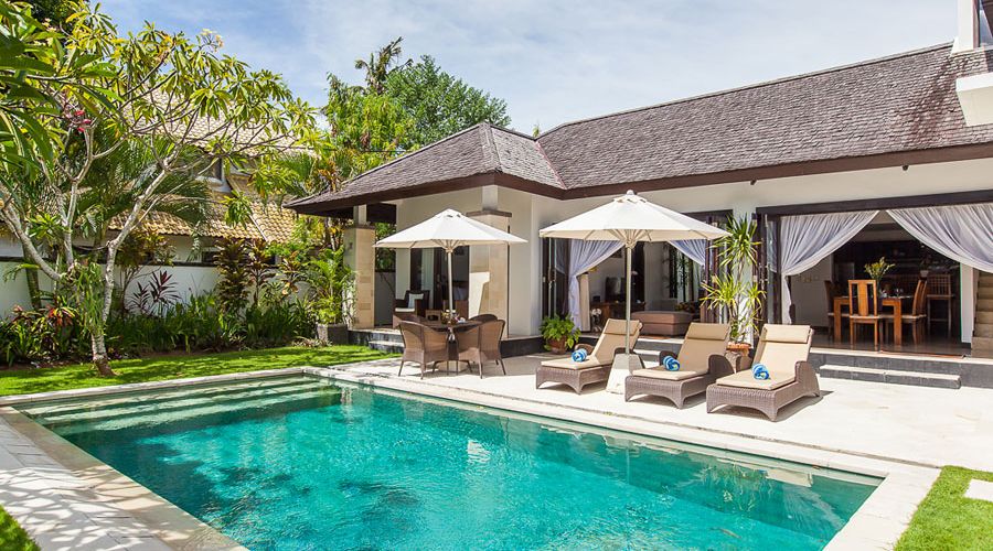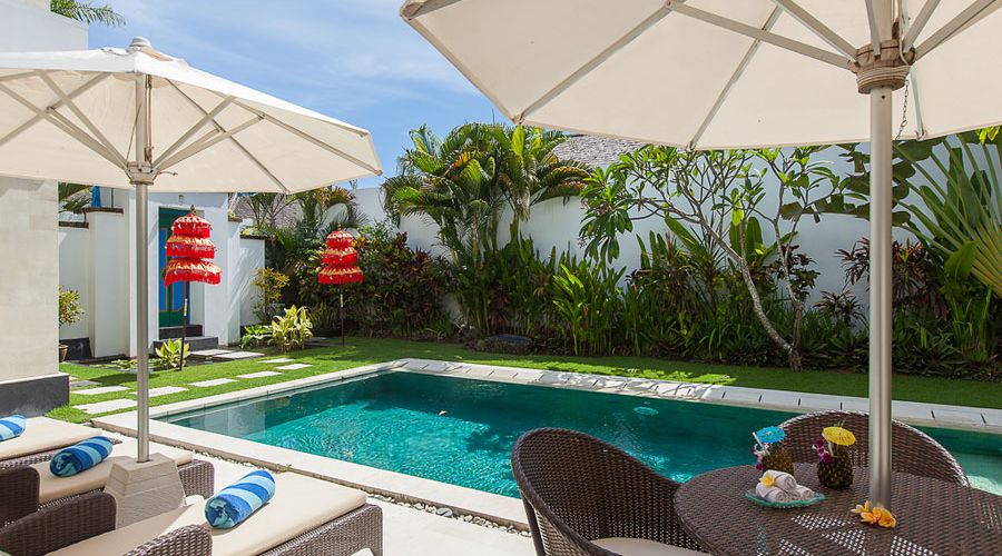 A terrace with 3 sun loungers runs alongside swimming pool which is in turn is surrounded by a well manicured lawn and simple tropical gardens. Round table with chairs is nice place to have 5 o'clock tea or dinner by the pool.