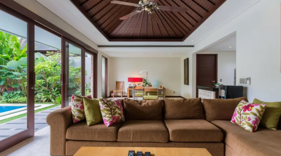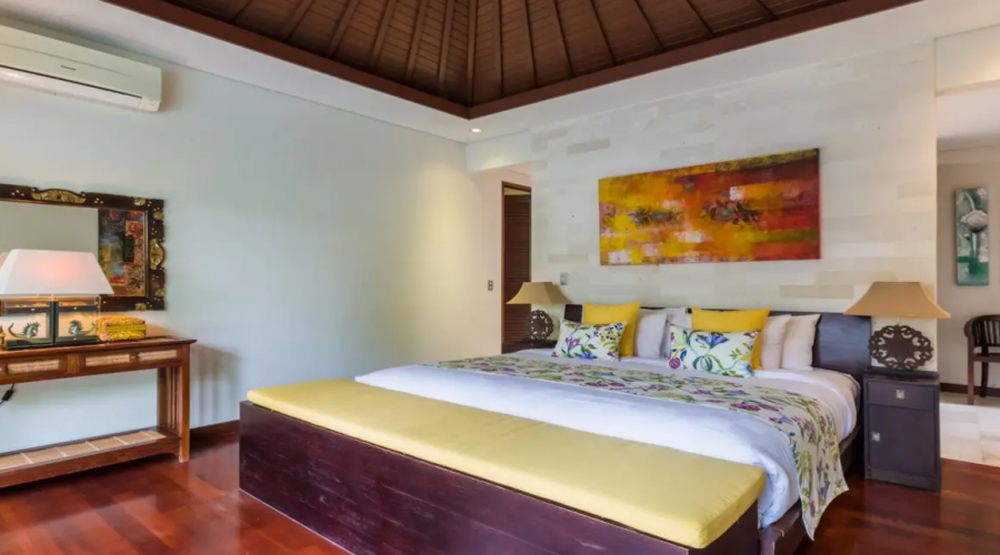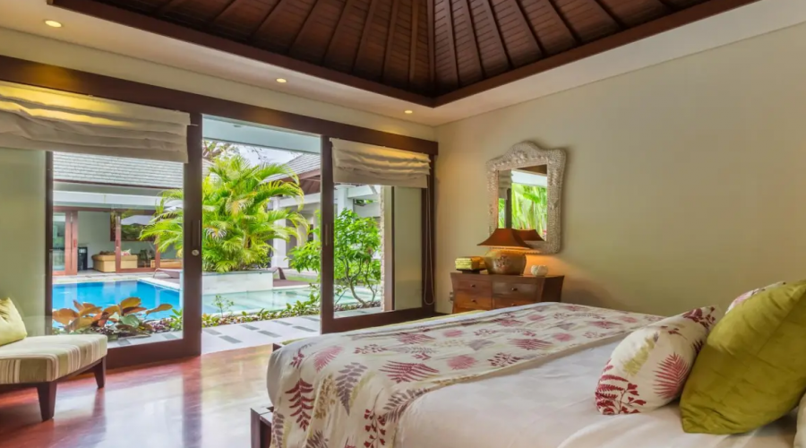 The infinity pool is set amongst a gorgeous garden and undercover bale to relax and enjoy a cocktail. You can enjoy the outdoor shower in the garden. Many hours will be spent enjoying the luxury of the tropical gardens and pool lounges. Furnished in a traditional Balinese decor, this villa offers the ultimate in luxury for your holiday.