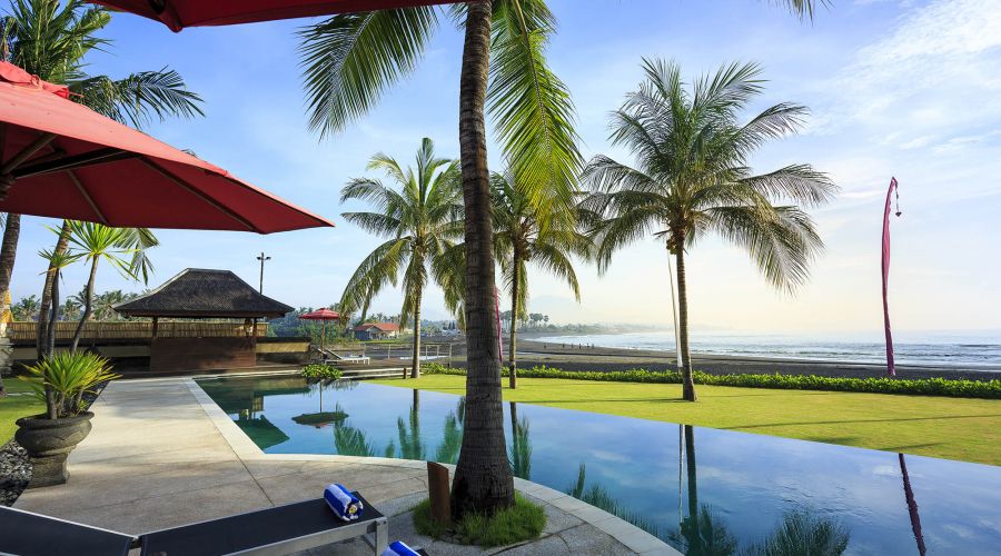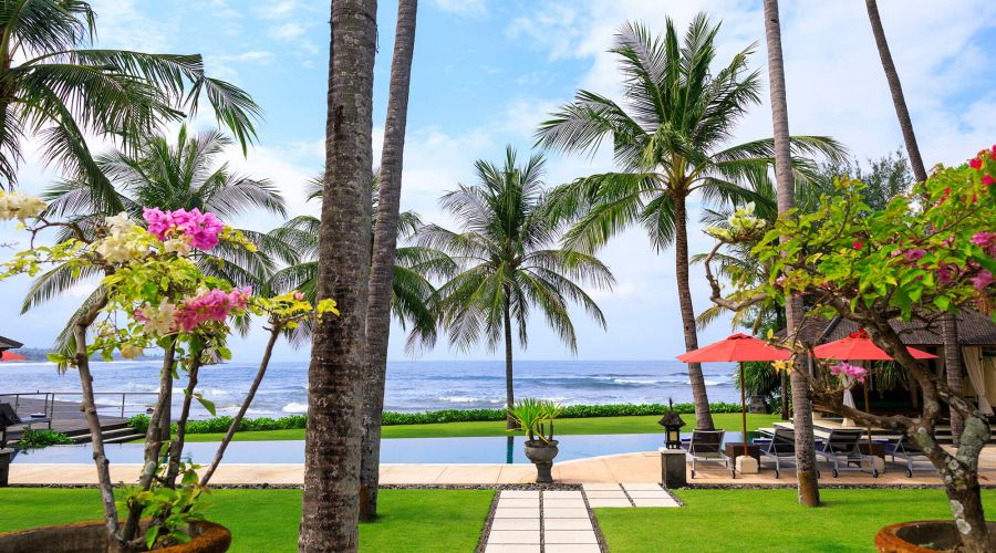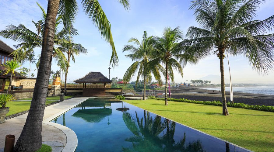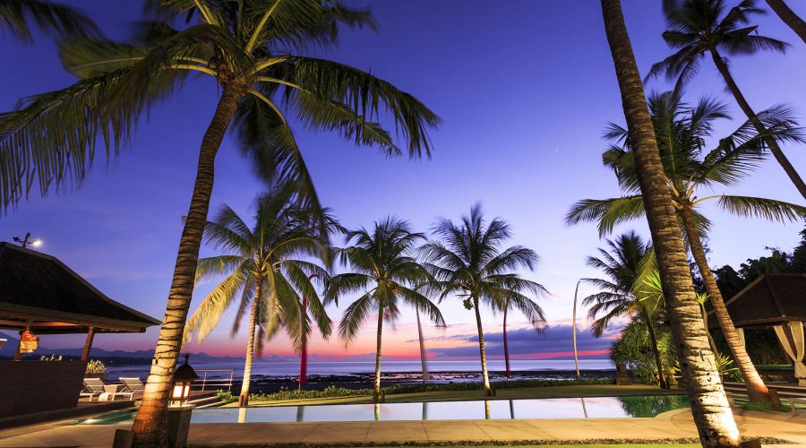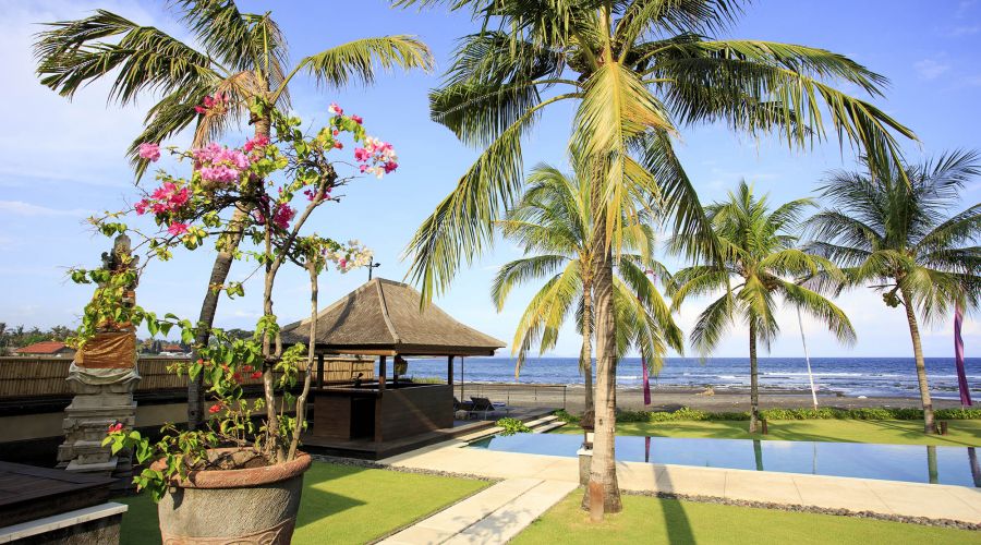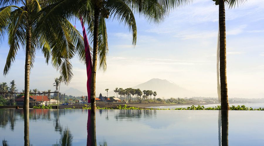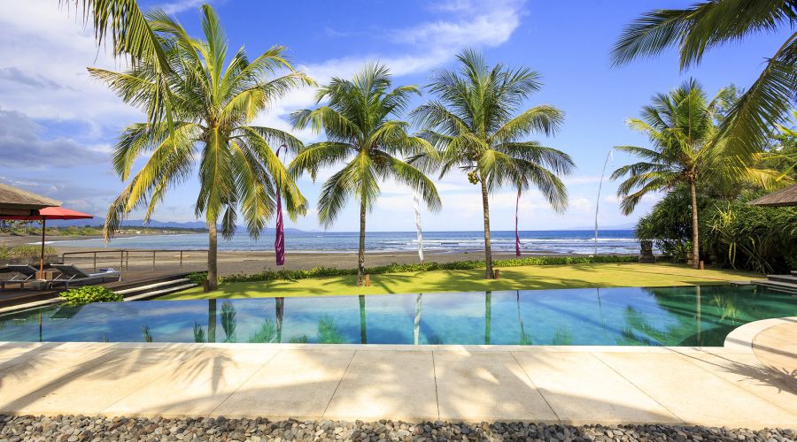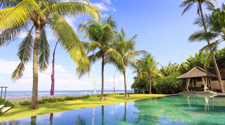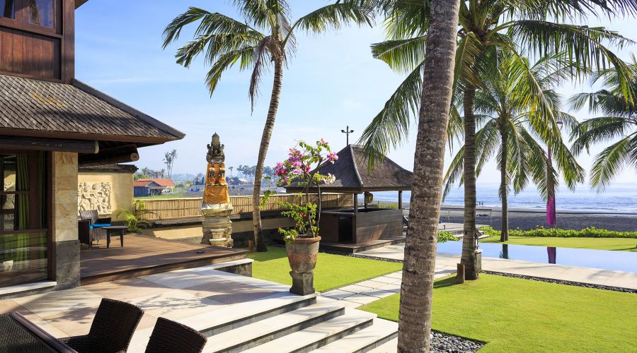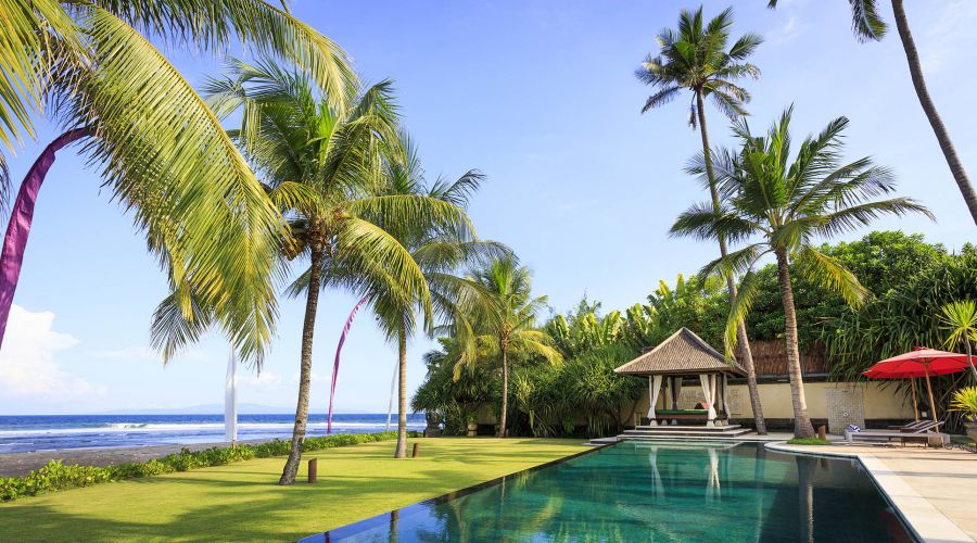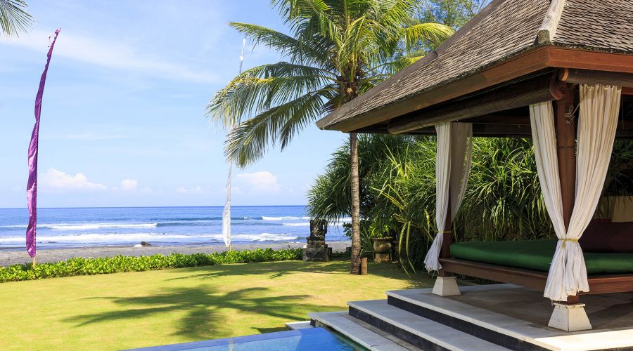 Situated absolutely beachfront, where river meets ocean on south-east Bali’s near-deserted Pabean Beach, this villa is blessed with captivating views of the pounding surf, mystical Mount Agung and the island of Nusa Penida.