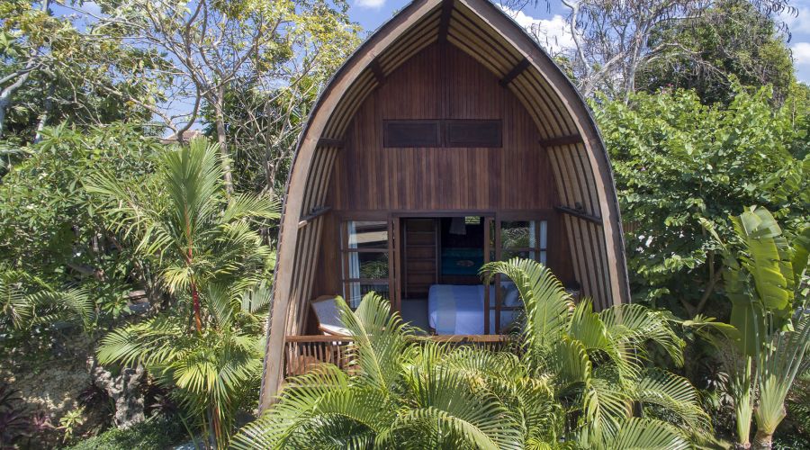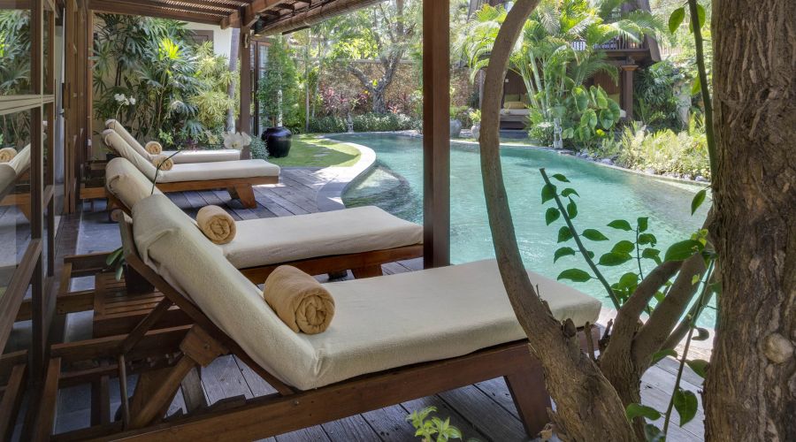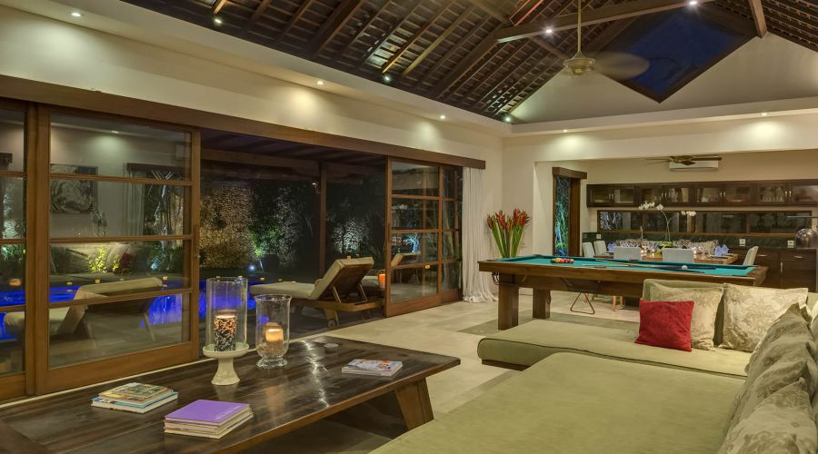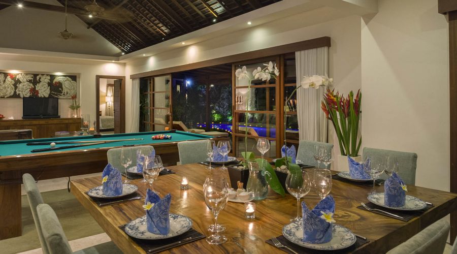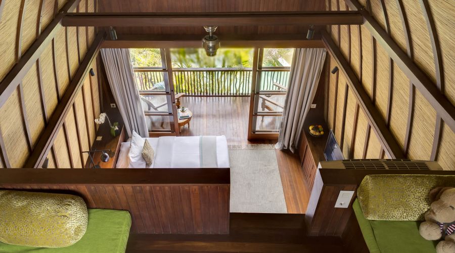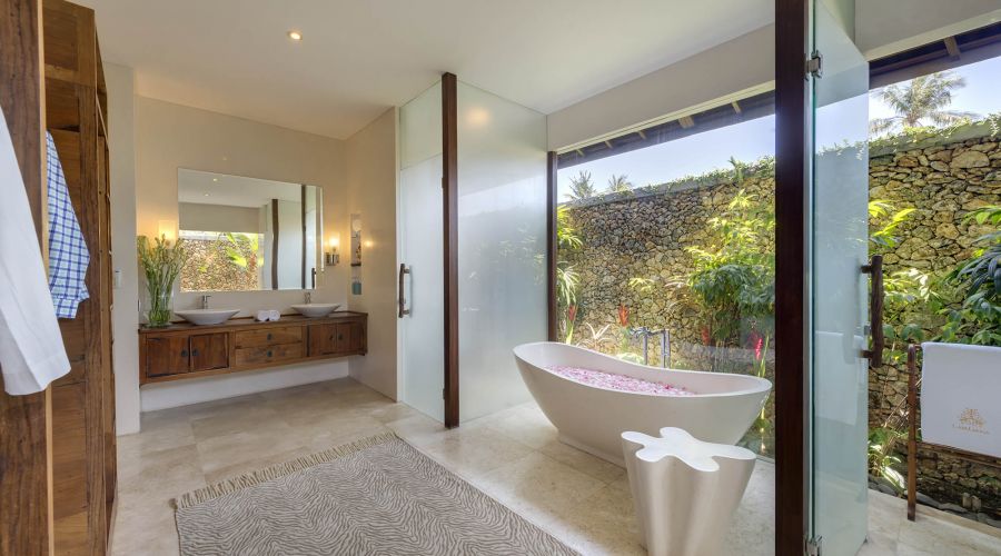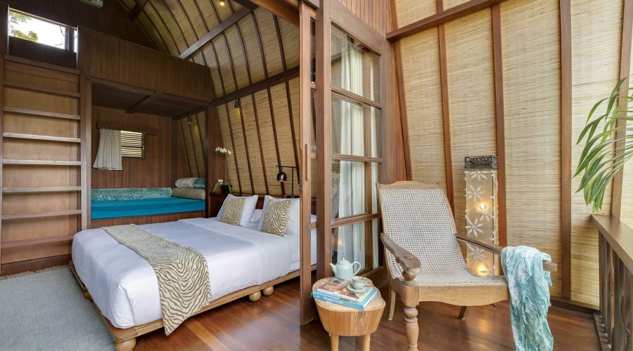 This villa presents two completely independent buildings: a single-storey ‘longhouse’ with a glamorous bedroom and bathroom complemented by a hugely spacious living, dining and kitchen area, and a two-storey building modelled on a traditional lumbung (rice barn), specifically designed for youngsters and/or teenagers and offering all the independence and amenities that they could possibly wish for.