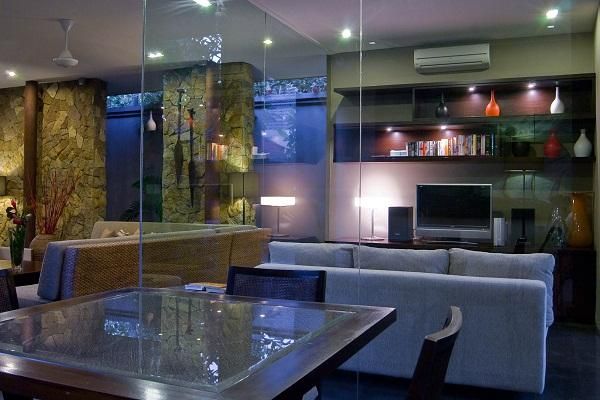 A glass enclosed entertainment room facing a patch of tropical greenery is fully air-conditioned. It features a cosy sofa, a flat screen television with satellite channels and DVD, as well a wide selection of reading materials for leisurely time out.