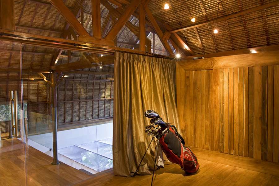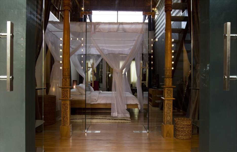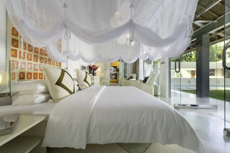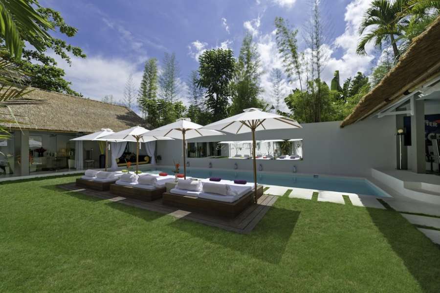 With total of 500m2 of land, this villa has an infinity pool with pool-side chill day bed, beautiful landscape garden and plenty seating area by the pool or in the main house. The air conditioned entertainment area shares the wood/glass/stone floor with low lighting throughout, including the kitchen and luxury office space on the ground floor. A thick wooden dining table accommodates 10 guests under the watchful gaze of a serene 3 meter tall stone buddha. The adjoining open plan kitchen/bar boasts an oversized boretti fridge/wine cellar which compliments the stainless counter tops and cabinets.