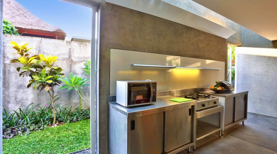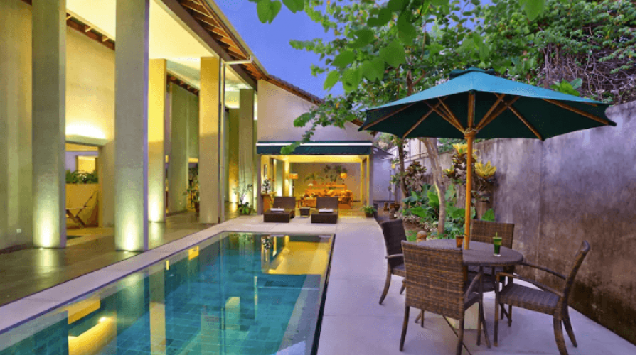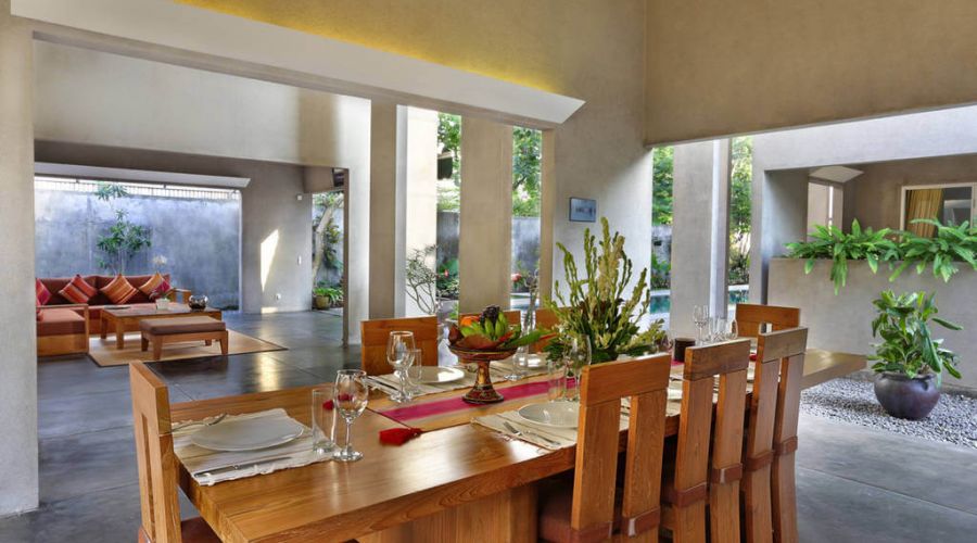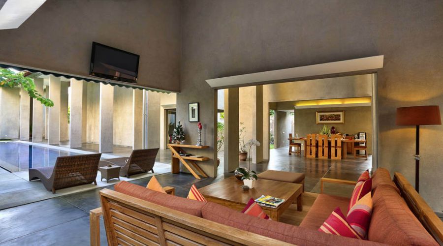 At this villa you can rise from your air-conditioned bedroom, throw open the sliding door and head outside to the shaded sitting area to recline on delightfully modern couch. Or take a seat by the pool and bask under the shade of a wide canvas umbrella surrounded by palm trees and fragrant hibiscus.