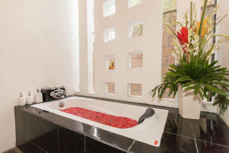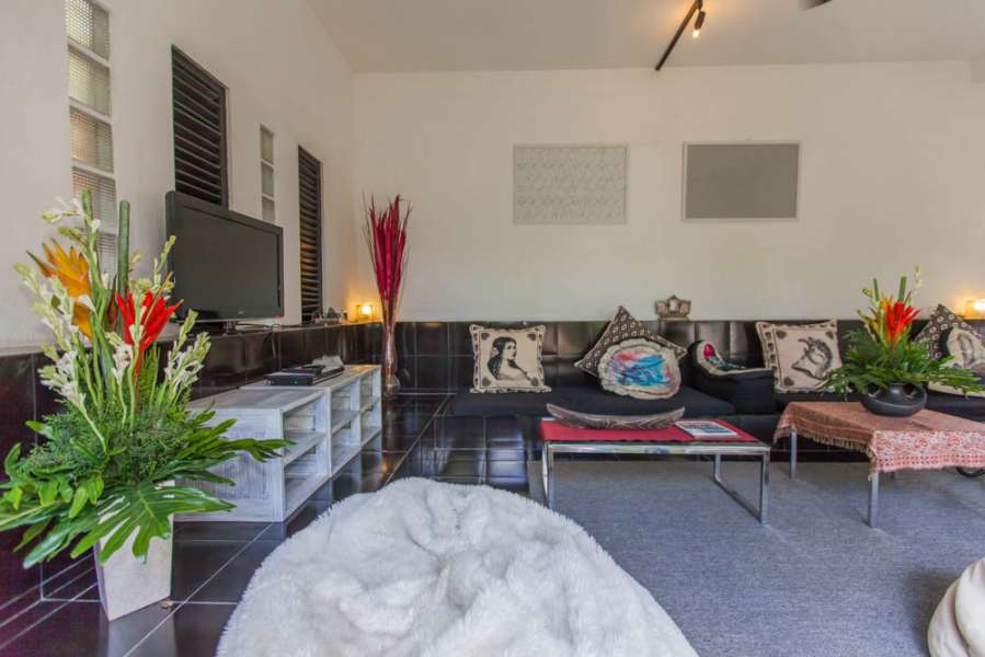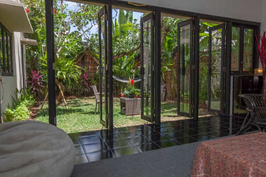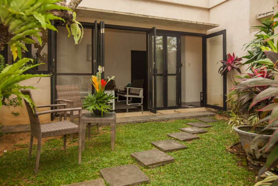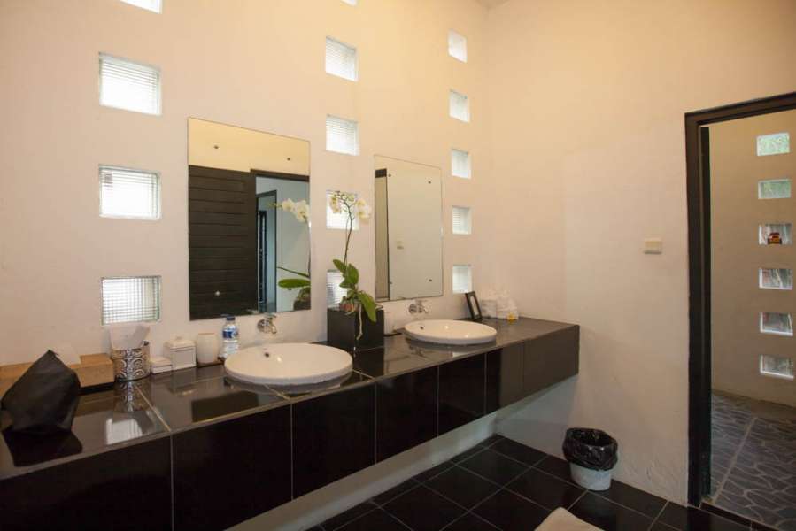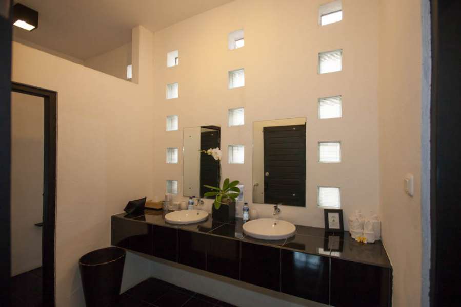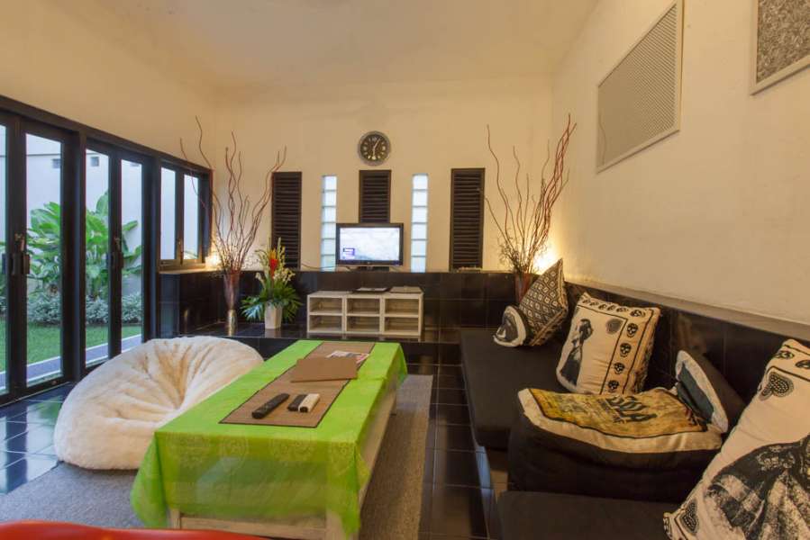 Decorated in a minimalist modern style, this is the perfect setting for young couples or business persons wanting to enjoy the clubs, bars and shops of Seminyak. As you walk in through the French doors, you will be impressed by the tranquility and style of this apartment. This room has cool black tiled floors and white walls throughout the property, with glass bricks conveniently positioned in the walls of every room allowing the sunlight to shine through. The living room is fan cooled, with TV, comfortable sitting area and a fully equipped adjoining kitchen; the kitchen has free drinking water, stove and fridge freezer.