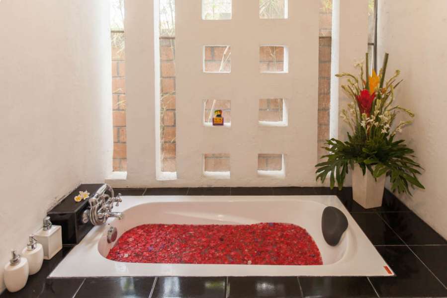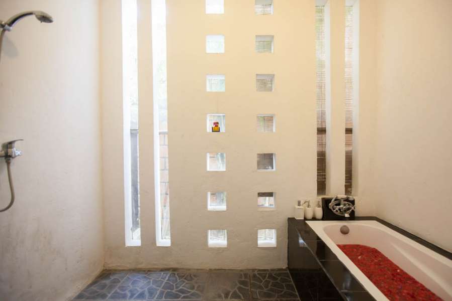 As you enter the air conditioned bedroom you will see that the minimalist style once again, as the bed is on a raised black tiled plateau with storage space for belongings either side of the bed. Also you have a small desk for writing postcards and sending emails to friends and family back home as well as a built in wardrobe is made of concrete and painted white, with hanging, shelf space and a separate bamboo rack offering you more than enough space for your clothing.