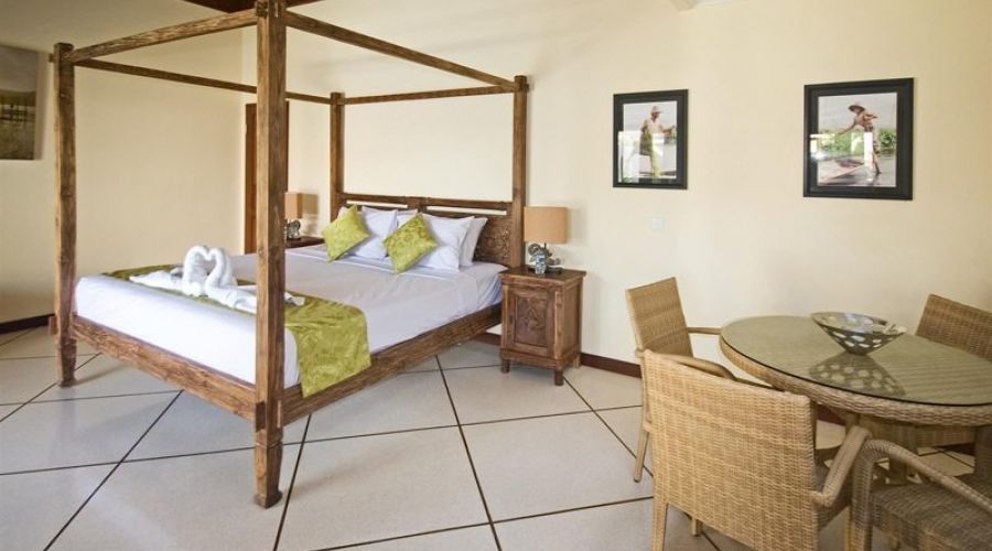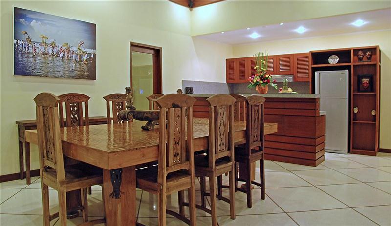 The main building, which overlooks the pool and tropical gardens, houses the comfortable living space, dining area and kitchen. The cosy living area has a sofa as well as three big cushioned lazy chairs, ideal for lounging in at the end of the day. This area also boasts a LCD TV with many international channels and DVD player, as well as the facility to play music throughout the villa – ensuring all your entertainment needs are covered. The dining area is just across from this living area, meaning that you are able to watch TV or a movie while dining. The large table and chairs also caters for a more formal dining style, allowing family and friends to sit together and catch up with each other at the end of the day. Once you are finished with your meal, the table also converts into a pool table.
