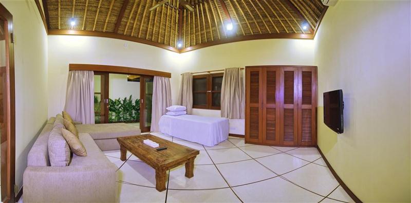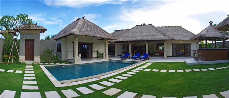 The most distinguishing feature within the villa is probably the fact that it has two generous sized swimming pools. Behind the small pool is also an impressive water feature of Buddha. There are also two shaded seating areas and a BBQ area with a fridge and sink, surrounded by lawn, tropical gardens and swaying palms.
