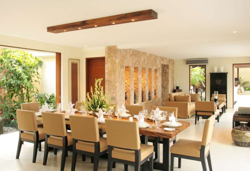 This villa offers four stunning private bedrooms in three main buildings, all with en-suite bathrooms. All bedrooms are fully air conditioned and each room can be opened to blur the lines between indoor and outdoor living. Two bedrooms have outdoor showers located in their own small private gardens that enables guests the ability to enjoy open to sky bathing. Bed linen, towels and bed covers are luxurious quality and provide a sensuous feel to relaxing, sleeping or bathing.