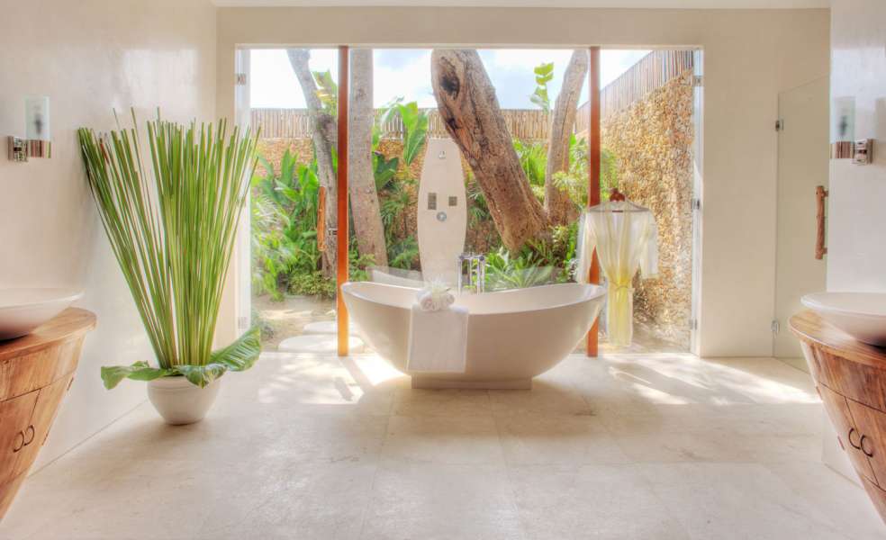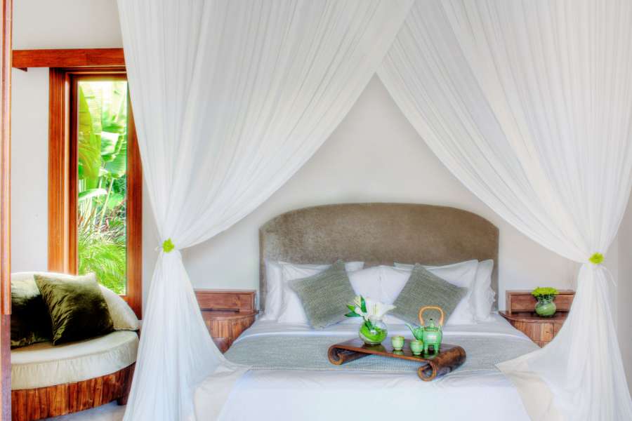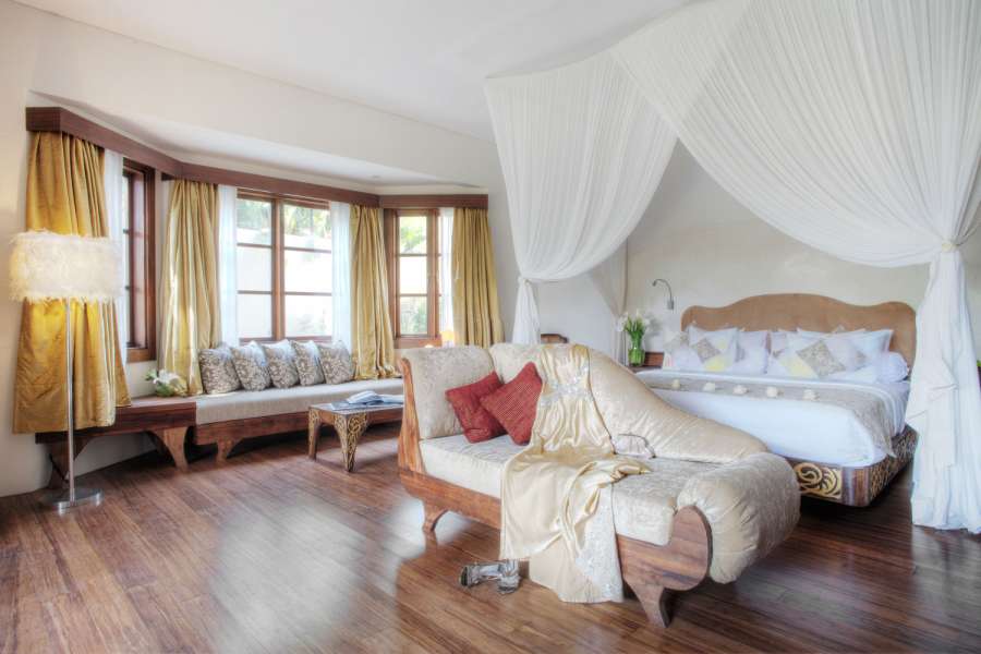 Four suites are furnished with canopied king beds and a smaller room has a queen bed. All air-conditioned rooms come with satellite channel TVs, Blu-ray disc players, iPod docks and ensuite bathrooms fitted with stand-alone soaking tubs and monsoon showers.