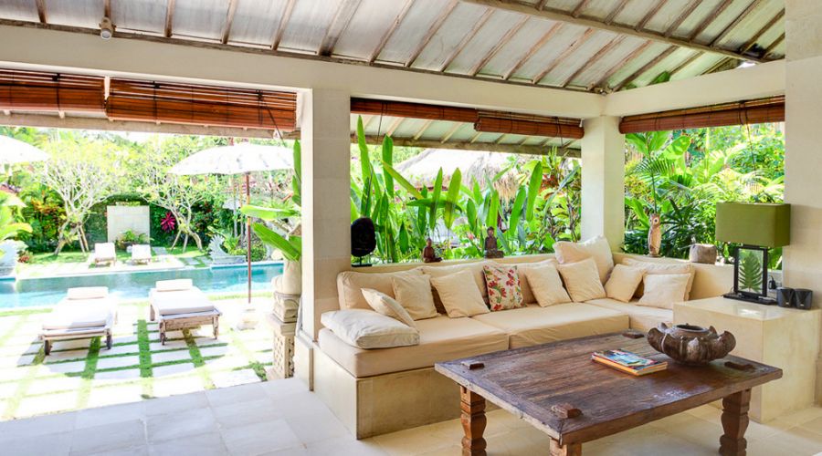 A definite highlight of this villa is that there are 3 swimming pools to plunge into, divided over two peaceful lush green gardens. In one of these sprawling gardens, the main 12-meter swimming pool gently overflows into a smaller pool in the lower level of the garden. How idyllic is that? The third swimming pool is tucked away privately at the back of the villa, the perfect place to enjoy some tranquility by the waterside. Both gardens feature reclining chairs and Balinese parasols as well as shady balés with tropical thatched rooftops to take a daytime snooze as the kids splash around in the swimming pools. Just wonderful!