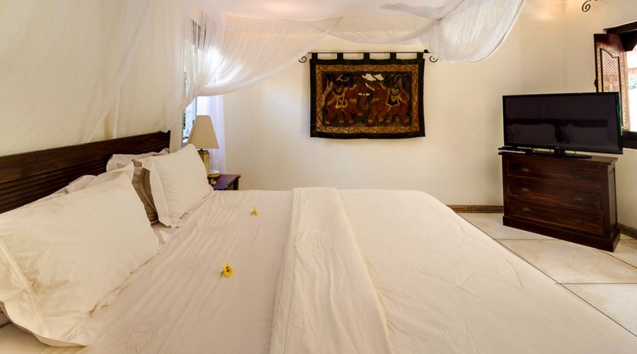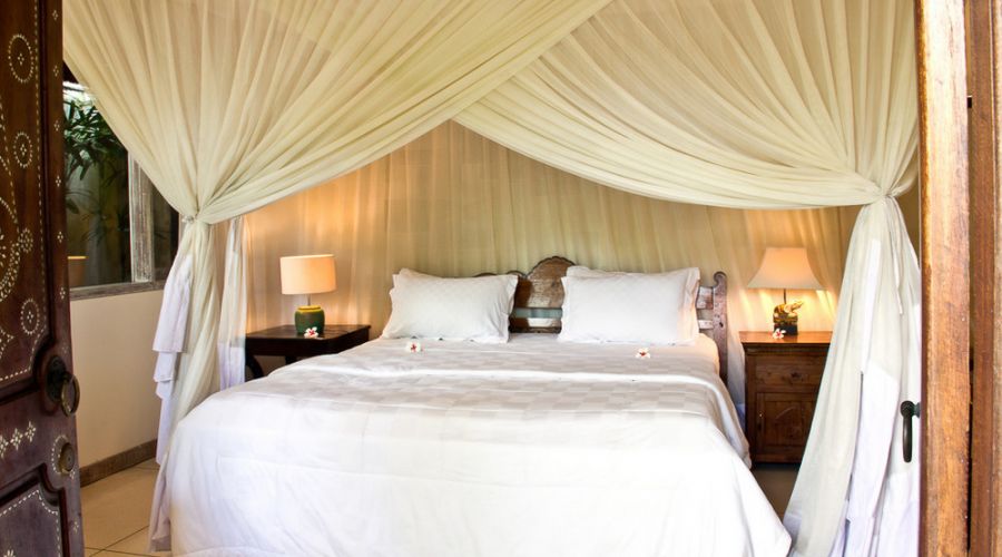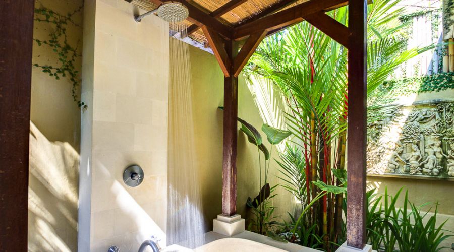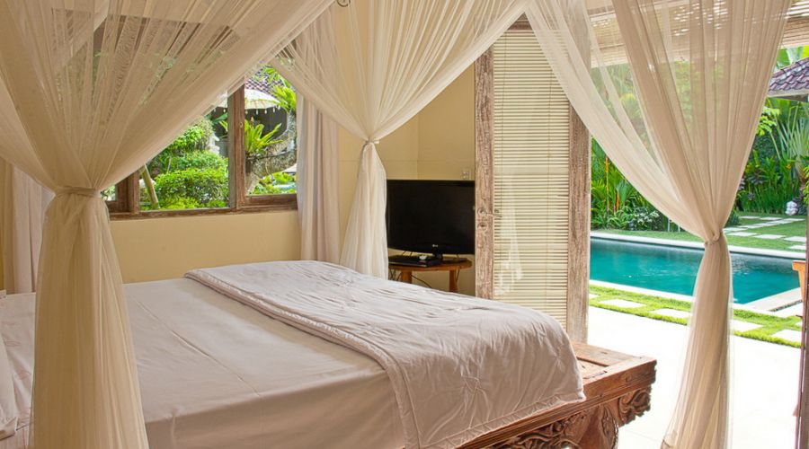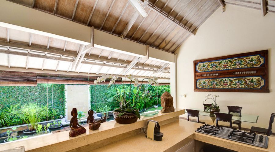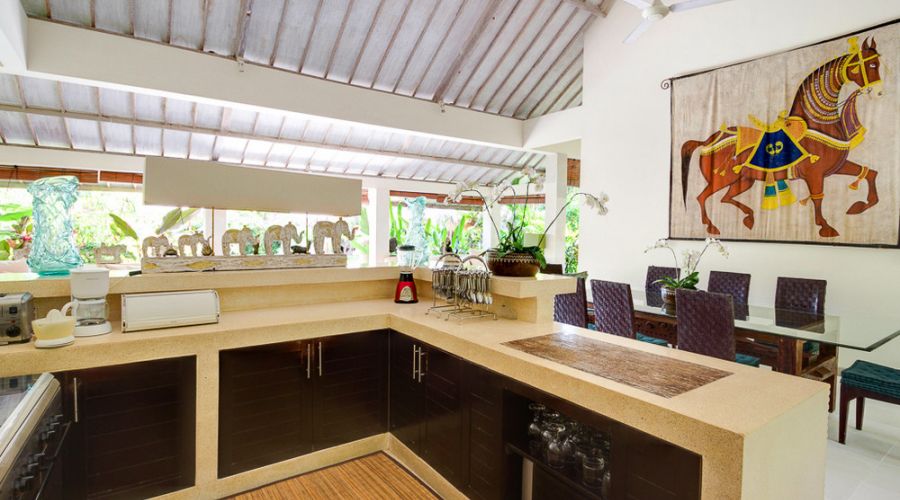 This villa houses a total of 6 bedrooms, 2 tucked away privately, 2 in the main house and 2 in stand alone bungalows the lower level of the garden, giving privacy to everyone. Each and every bedroom is perfectly restful and comfortable, decorated tastefully with traditional artwork, fitted with a large canopied king-size bed of which 2 can be split into twin beds and every room has their own satellite television with DVD-player to watch a movie or two before sleep, in the comfort of your own bedroom. The rooms have generous-size wardrobe closets and private en-suite bathrooms designed open-air for the full-blown tropical open-air showering and/or bathing experience. Guaranteed you will love it!
