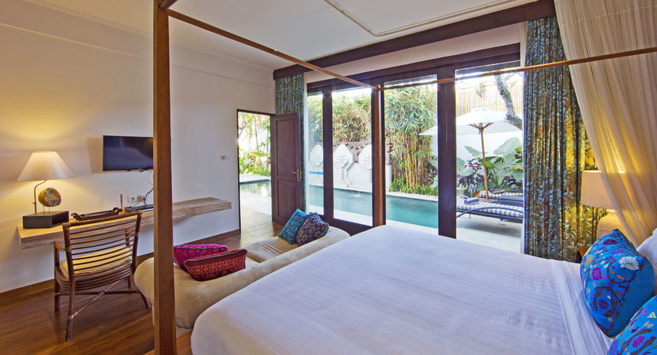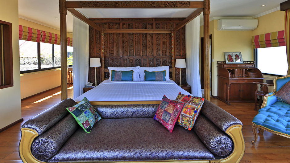 The other two bedroom is a home with an exotic Indian theme fit for a Maharajah. The picturesque hall is created by interior designer, Melati Danes. The entrance is a work of art with a traditional Indian touch. The reflection pool is adorned with an Indian designed water feature and specially treated walls to make this villa your Indian home in Bali.