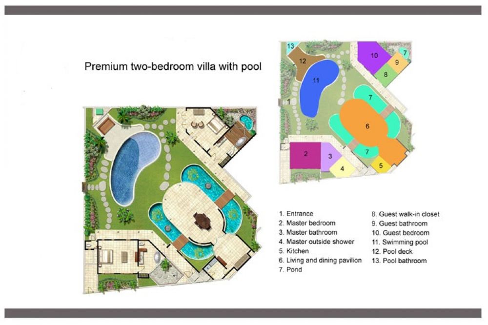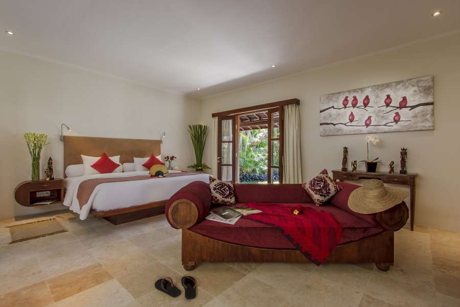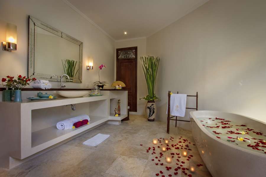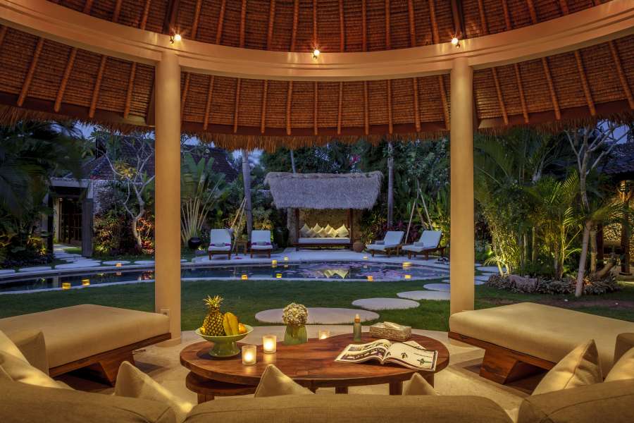 The open plan nature of this villa floods it with light and a sense of space. This two bedroom villa provides the perfect sanctuary for a family or group looking for privacy and a tropical escape. Both bedrooms boast comfortable sofas on which to relax, with large doors opening directly onto a pool splashed in sunshine, whilst the spacious bathrooms, with stand-alone bathtubs, will definitely impress the most discerning. Sit on the long curved sofa in the open living area, or curl up at night and enjoy the views across the pool to the traditional bale, or recline in the air-conditioned media room and watch satellite television; the options are endless. A discreet gate in the garden will lead you to the secluded paradise of one-bedroom villa next door should you require extra room for the extended family.