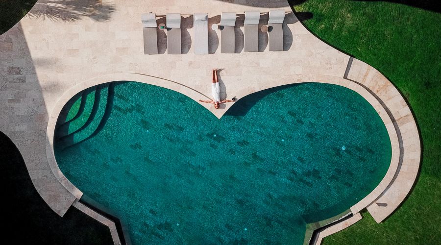 This villa boasts a capacious outdoor area. From the sparkling freeform pool, you’ll look out to vat, open surroundings made of swaying palms and lush foliage. A neatly manicured lawn stretches out around the pool area, providing ample space for sunbathing, outdoor yoga and barbecue dinner parties.