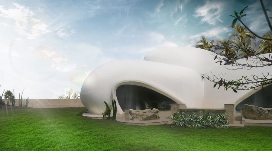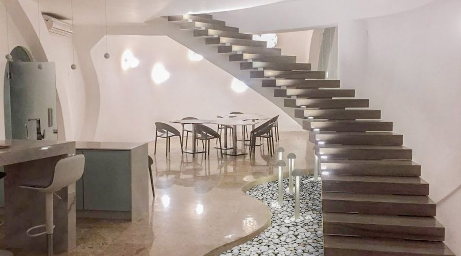 Just like the architectural design of the villa, the living areas are unique: full-length glass windows take on a rounded, cloud-like shape, a stairway without handrails curves upwards to the second floor and multiple hexagon-shaped tables are placed together to form a communal dining space.