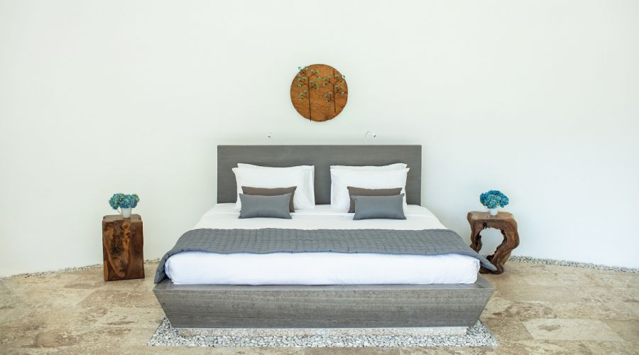 Six guests are comfortably accommodated in three bedrooms, all of which feature soothing hues of white, grey and earth tones, a double bed, quality linen and en suite bathroom. Each room is adorned with a choice selection of ornaments, including paintings, rugs, hanging lanterns and accent chairs.