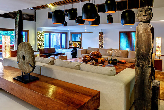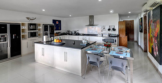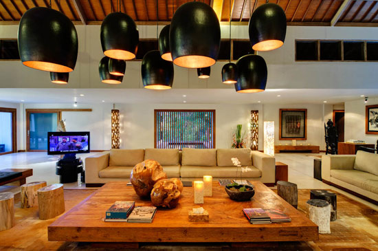 -A large reception and living area features a huge designer sofa sectional that surrounds a massive teak table, as well as a modern kitchen with bar, office, and dining room. The villa has a private cinema, tennis court, two swimming pools, and a helipad.