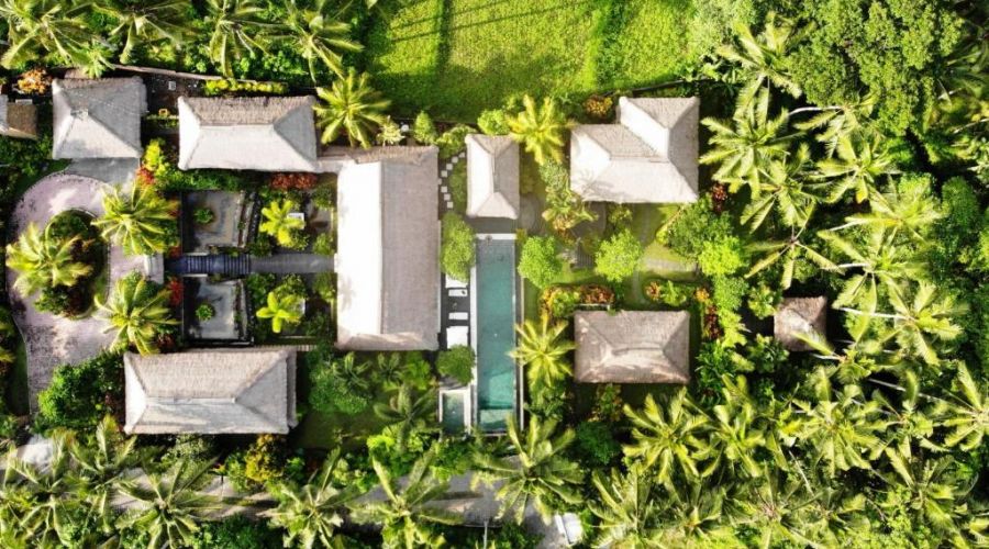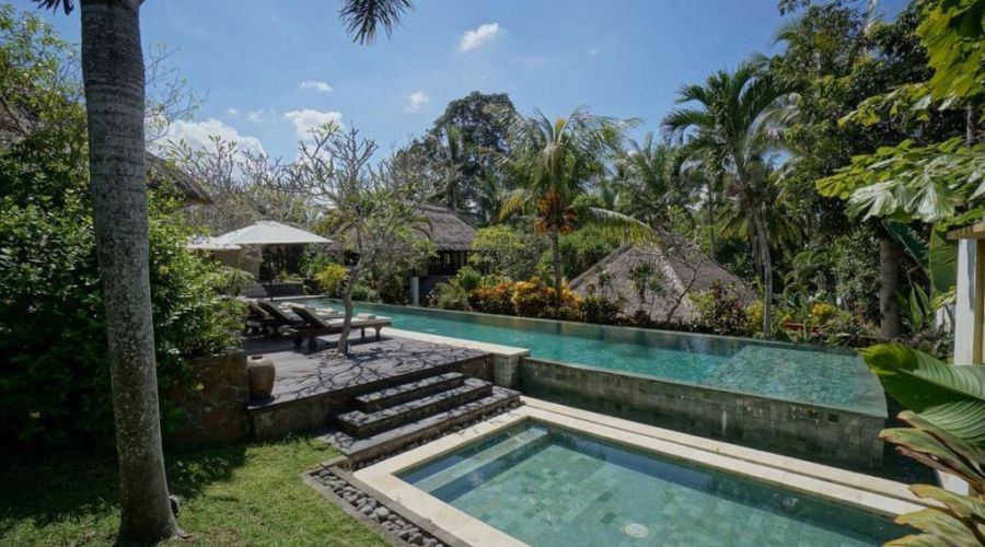 The focal point of the property is the open-air living and dining pavilion which drops down onto the 20 x 4 meter lap swimming pool and the children pool, filled with salt treated water, overlooking to rice field.