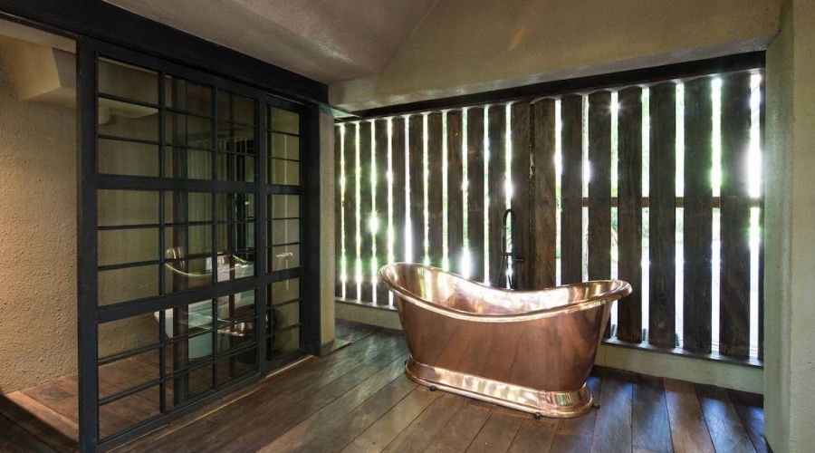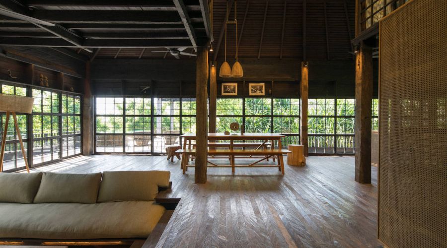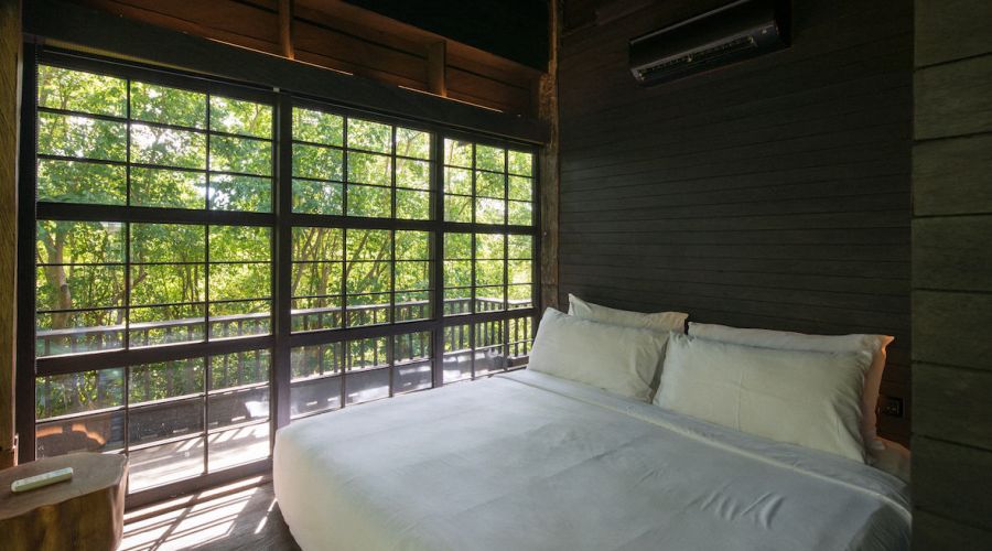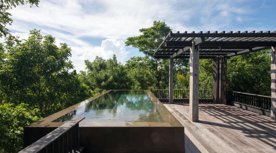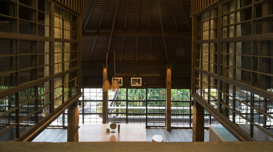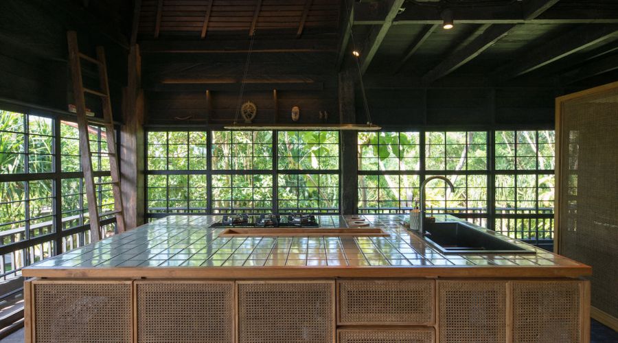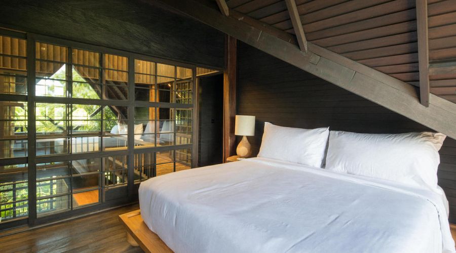This four bedroom villa has a distinctive architectural style with Japanese influences. Made entirely of dark wood with plenty of different areas to rest, play, and enjoy. The ground floor features a glassed-in private one bedroom with king bed. The second floor houses the master king bedroom nestled in next to the garden. The kitchen is chic and complete, made for daily living, with a beautiful and comfortable sunken living area. The second floor opens into an outdoor living and dining area with a lifted saltwater pool. The two king bedrooms on the third floor have large triangular windows taking full advantage of the views.